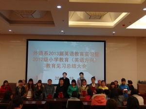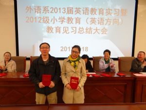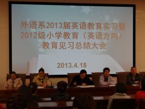 2013年4月18日下午,外语系2013届英语专业实习及2012级小学教育(英语方向)专业见习总结表彰大会在图书馆一楼报告厅举行。外语系领导、实习指导教师、英语专业2013届毕业生、小学教育(英语方向)专业2012级学生、2011级英语教育专业学生参加了会议。 会上,实习指导教师代表葛木仁和见习指导教师代表红霞结合各自的实习、见习指导工作发表了指导感言。优秀实习生代表汇报了实习的感想和收获。会议还对实习、见习工作中涌现出来的优秀实习指导教师、优秀实习生进行了表彰奖励。