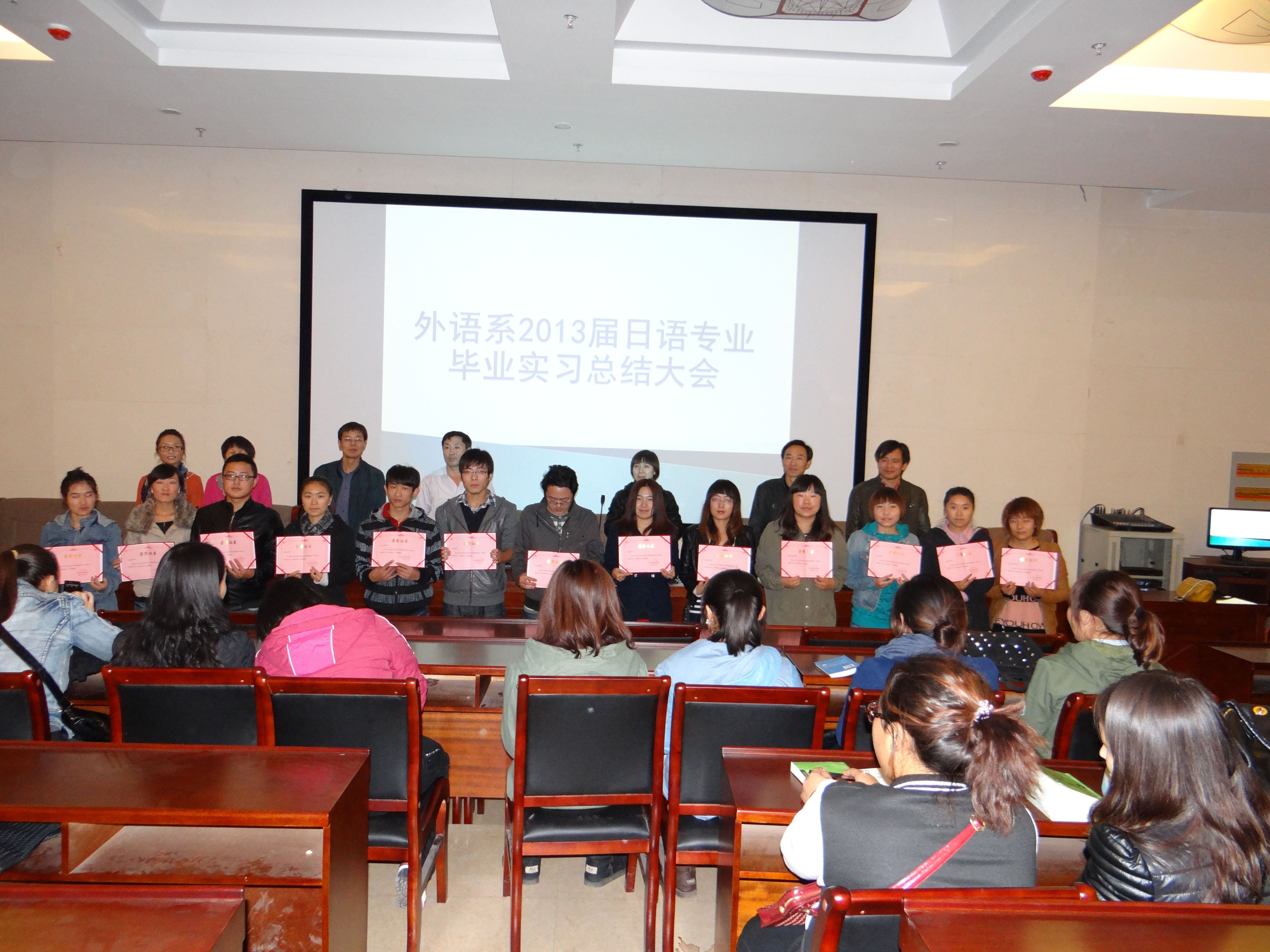 2012年11月1日下午4:30-6:00,外语系在学院图书馆一楼报告厅召开了2013届日语专业毕业实习总结大会。大会由外语系副主任苏日嘎拉图主持,外语系主任肖查娜、日语教研室全体教师、实习班班主任、日语专业2013届全体毕业生、日语专业三年级各班班团干部参加了大会。