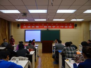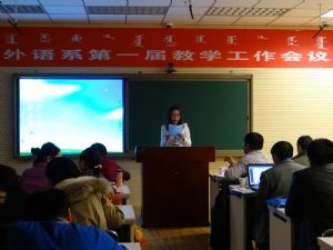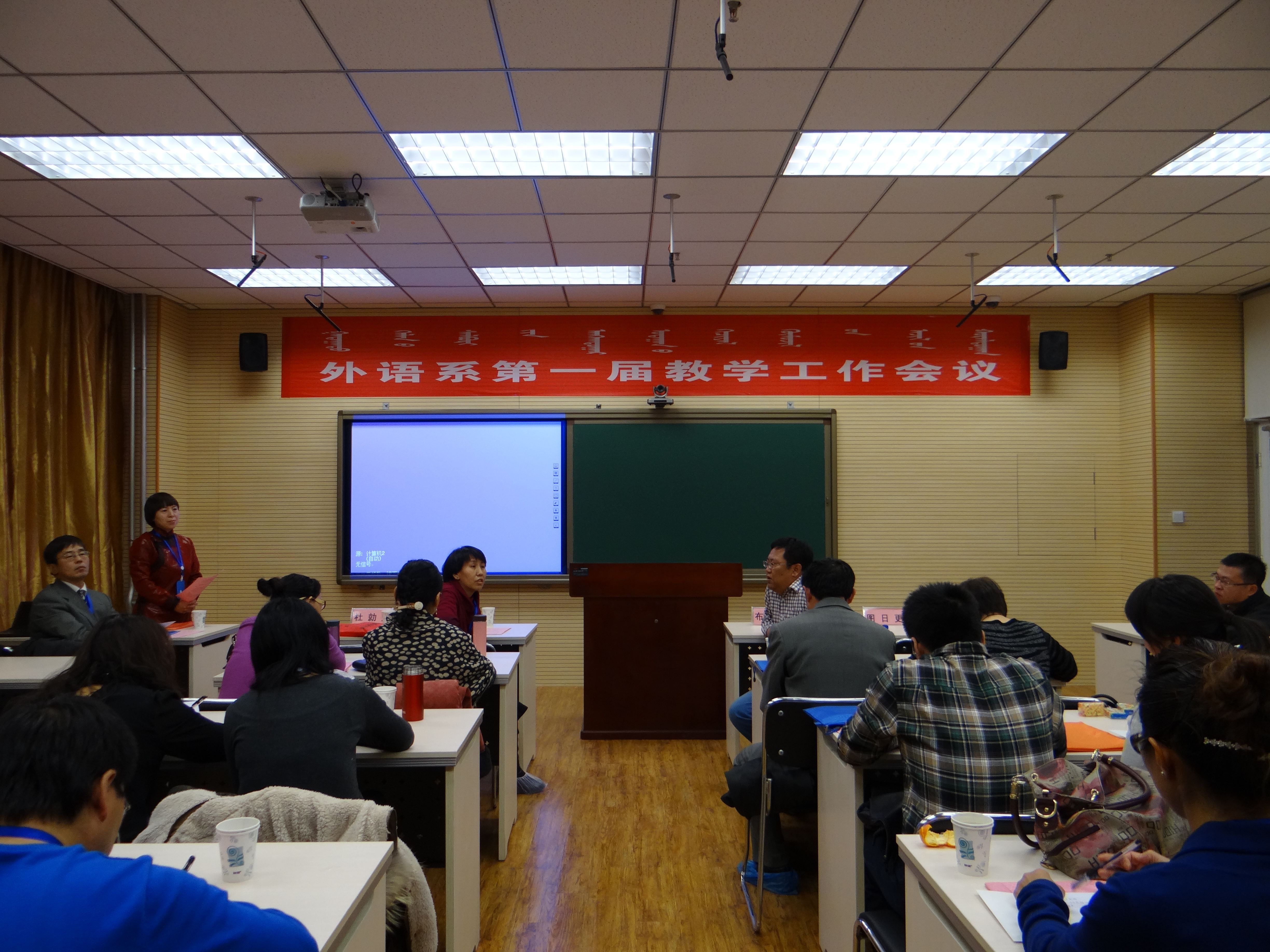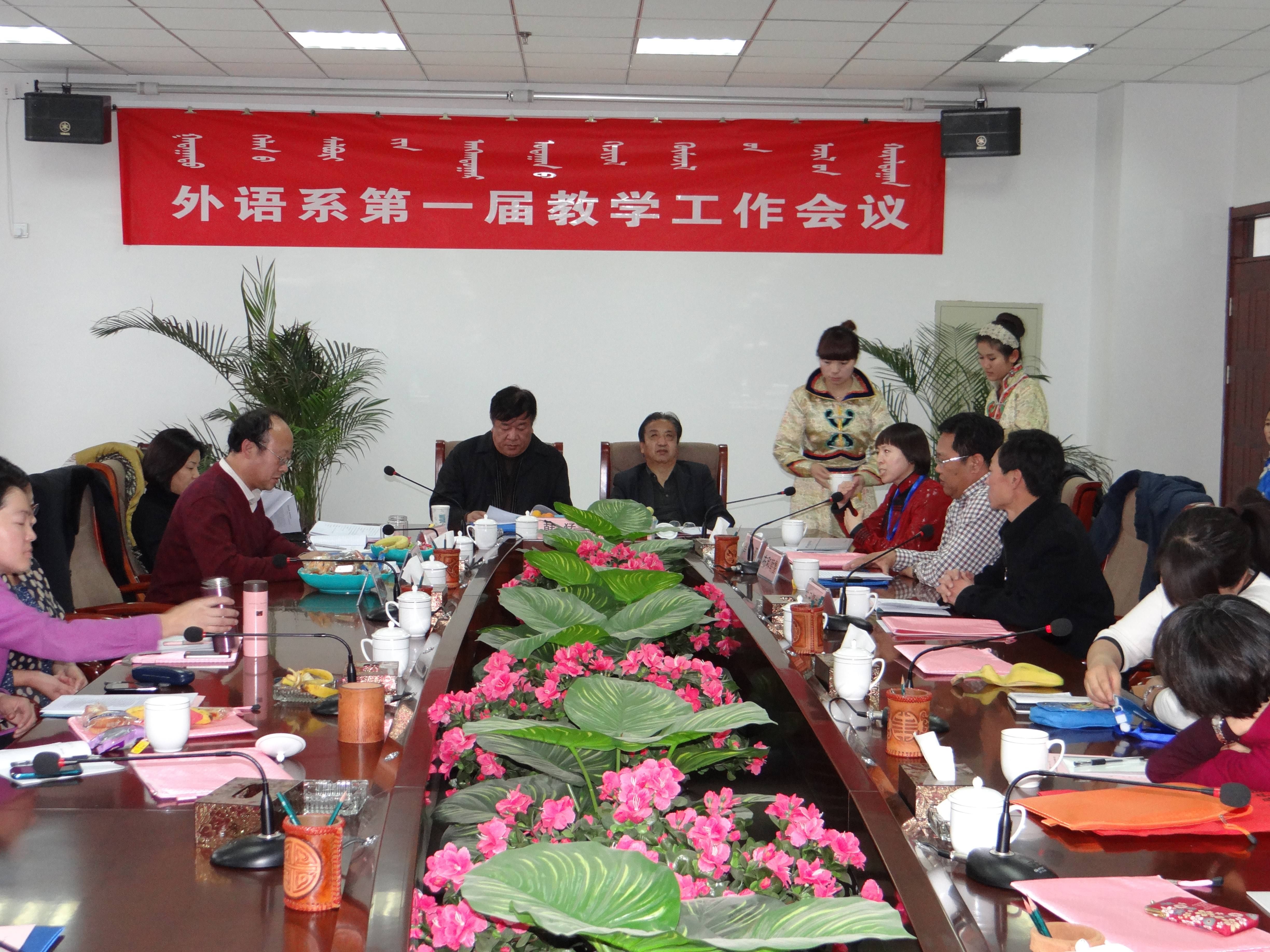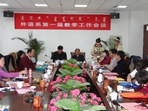 2012年12月1日,外语系在学院综合楼召开了外语系第一届教学工作会议。学院布和温都苏副院长、韩猛副院长、教务处纳丽娜处长、学院教指委包山虎教授、杜勍妹教授、图日根教授、外语系全体教师及八名学生代表参加了会议。