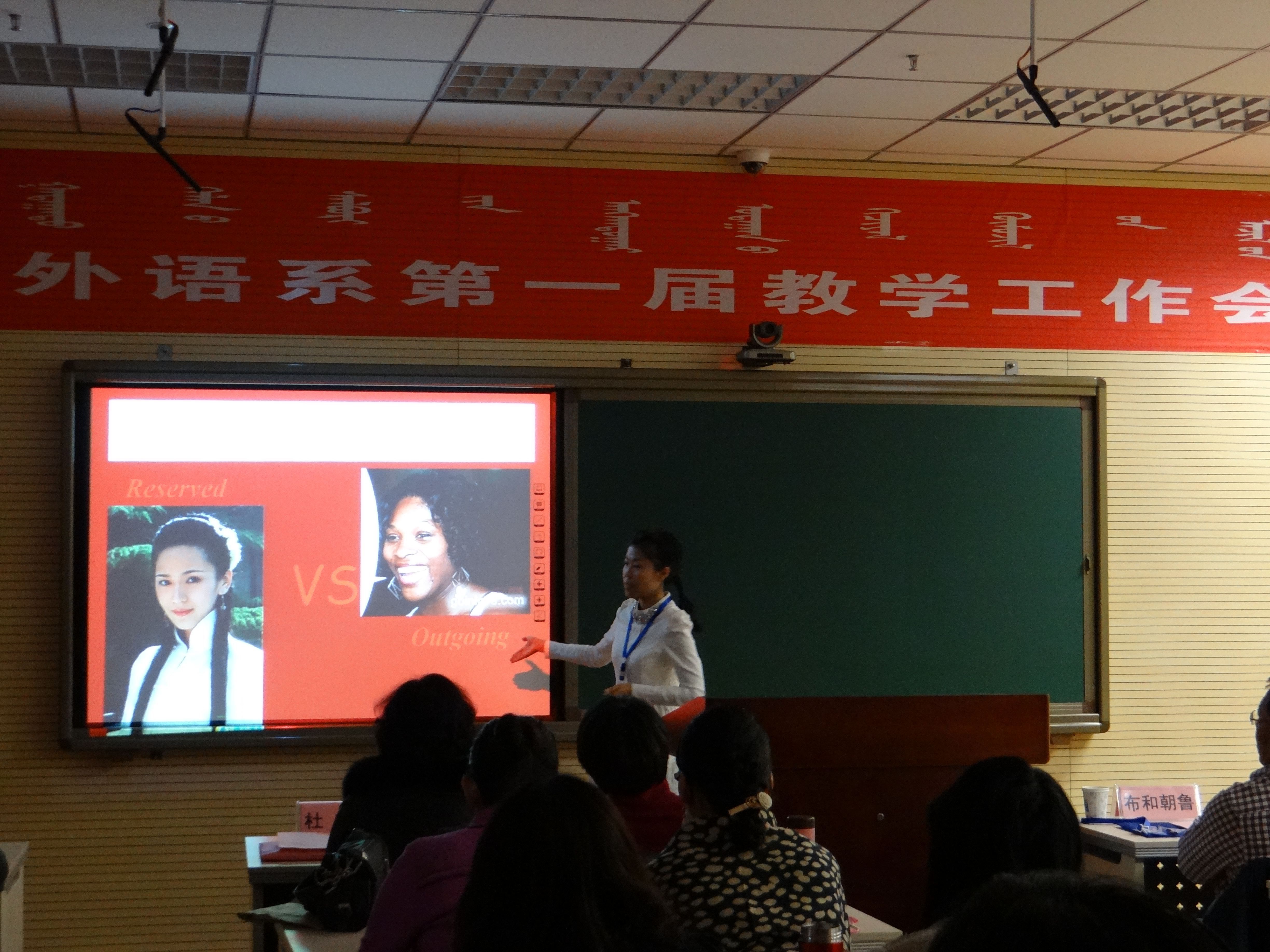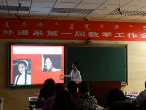 外语系肖查娜主任以《讲团结、促发展、重创新、显实效》为题,从教学工作总体思路、取得的实绩、目前存在的突出问题,以及应对措施四个方面对外语系2011、2012两年的教学工作做了全面总结。与会人员还一起观看了在2012年度全国民族院校大学英语课程教学观摩比赛中荣获一等奖的中央民族大学外国语学院赵明珠老师的比赛光盘;在学院第七届青年教师课堂教学技能大赛中获一等奖的我系教师朝木丽格开出观摩课;2012年度全国民族院校大学英语课程教学观摩比赛二等奖、学院第七届青年教师课堂教学技能大赛二等奖获得者包丽娜老师畅谈了两次参赛经历。与会师生还就教学技能提高、教学模式、教学方法改革以及教学质量提升等问题进行了研讨,并对学院和本系教育教学管理工作提出了意见和建议。韩猛副院长、纳丽娜处长就师生们提出的问题进行了详细解答,并先后发表重要讲话。最后,外语系党总支书记布和朝鲁宣布了2012年度外语系表彰决定,对优秀教研室,教师教研、科研成果,先进工作者进行了表彰奖励。