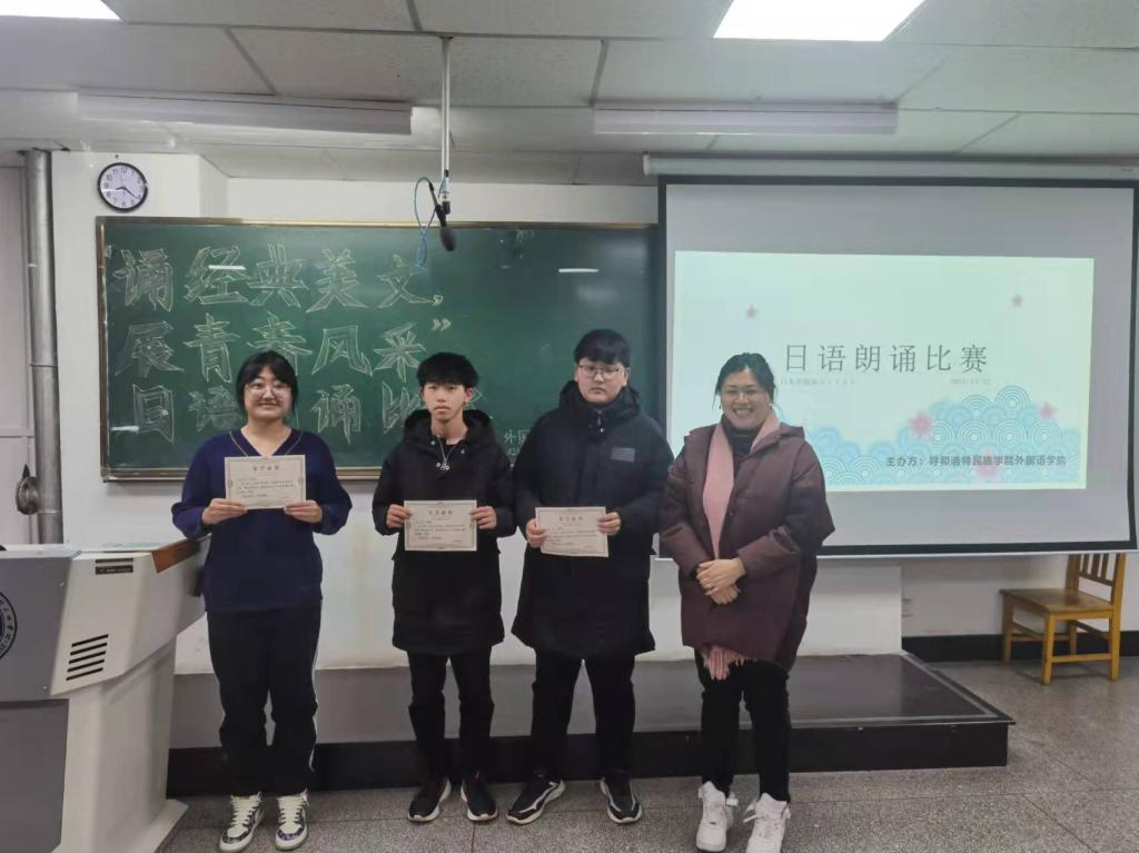 为锻炼同学们的口语表达能力、自我表现能力,展现大学生的专业风采,营造良好的日语学习氛围,12月12日晚7时,外国语学院于尚智楼314教室举办“诵经典美文,展青春风采”日语朗诵比赛。日语教研室何桂花老师、包金兰老师、高乌兰老师、白红梅老师担任本次比赛评委,参赛选手为在校日语专业学生。