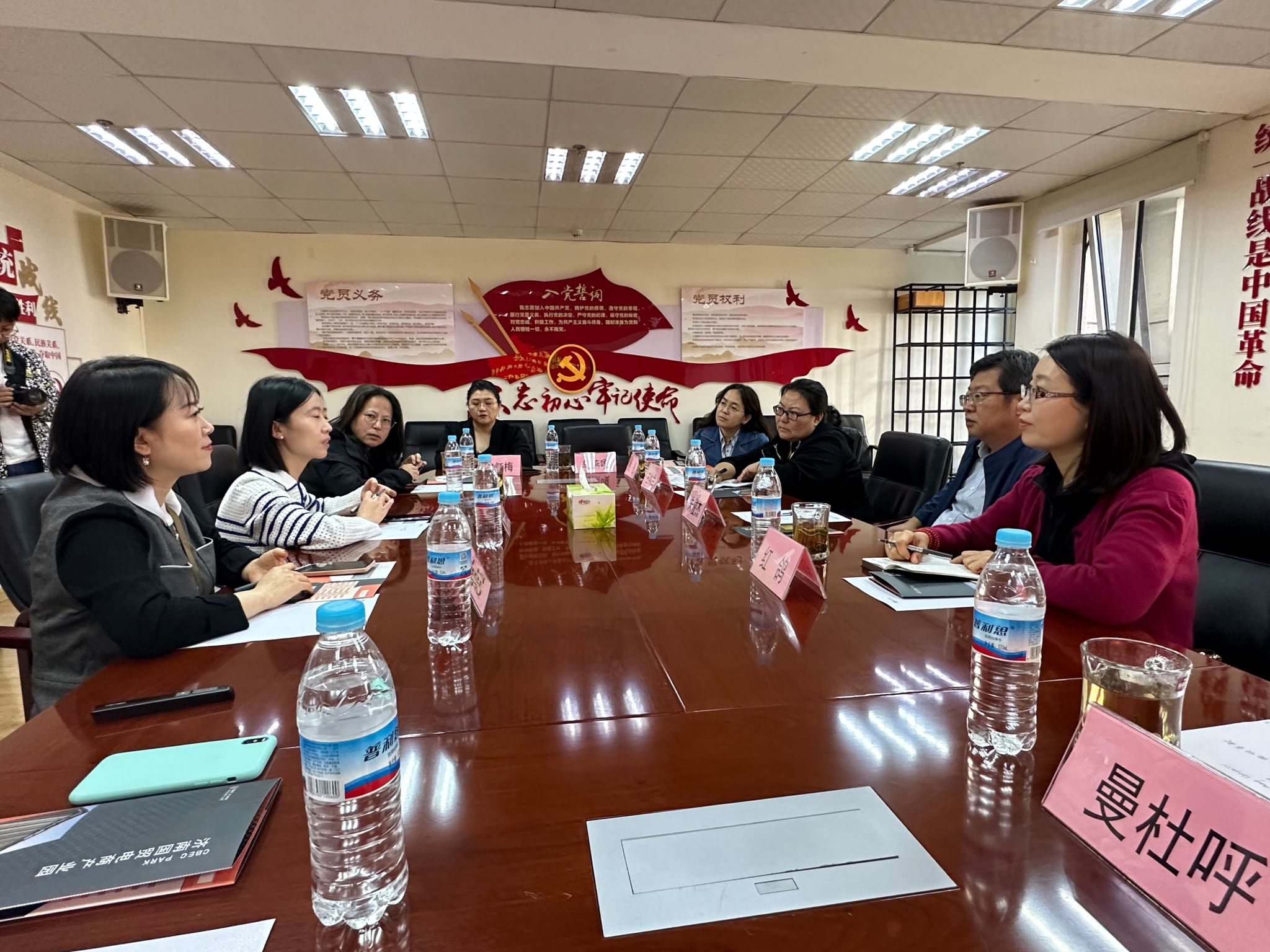 随后,学院调研组与国贸电商产业园区负责人在会议室进行了座谈交流。国贸电商产业园的招商运营部部长丁国甄和综合部部长赵婵玉分别详细介绍了国贸电商产业园的企业服务、入驻模式以及园区的综合发展情况。座谈会上,双方就孵化器的运营模式、跨境电商行业的现状和前景、相关企业对人才的需求,以及实训基地的建设等方面进行了深入的交流。丁国甄和赵婵玉详细回答了参会教师的提问。