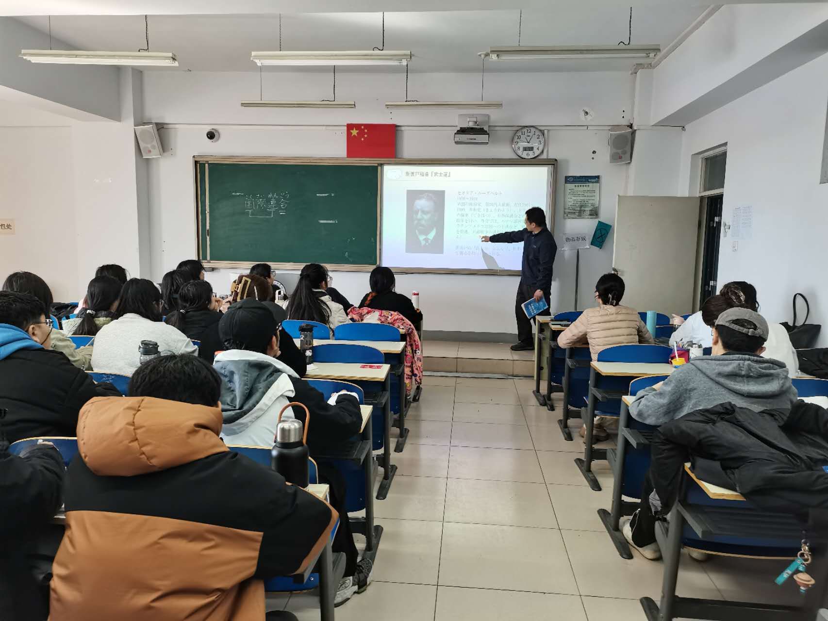 在《大学日语》课堂上,外聘教师马福山生动地展现了日本文化和语言学习的关联,有机融入课程思政元素,让学生在轻松愉快的氛围中掌握了课程的核心内容。马福山老师鼓励学生积极运用日语进行交流,提高学生的语言实践能力,培养学生的国际传播能力。听课教师对马福山老师的教学方法和课堂管理给予了高度评价,认为他的课程内容充实,且能够很好地激发学生的学习兴趣。
