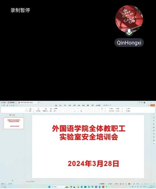 为传达学校相关要求,共同维护校园安全,3月28日,外国语学院在腾讯会议上开展了面对全体教职工的实验室安全培训会。会上,秦红喜副院长强调实验室及其他教室要遵循谁上岗谁负责的原则,老师要以身作则,并提醒学生:开关、电源上面不要放其他个人物品,易燃易爆物品要远离电源。上完课或者做完实验,离开教室时要及时关闭电源,放假前要检查是否关紧门窗。校园是老师和学生日常生活工作的主要场所,守护校园安全离不开每一个师生的共同努力。