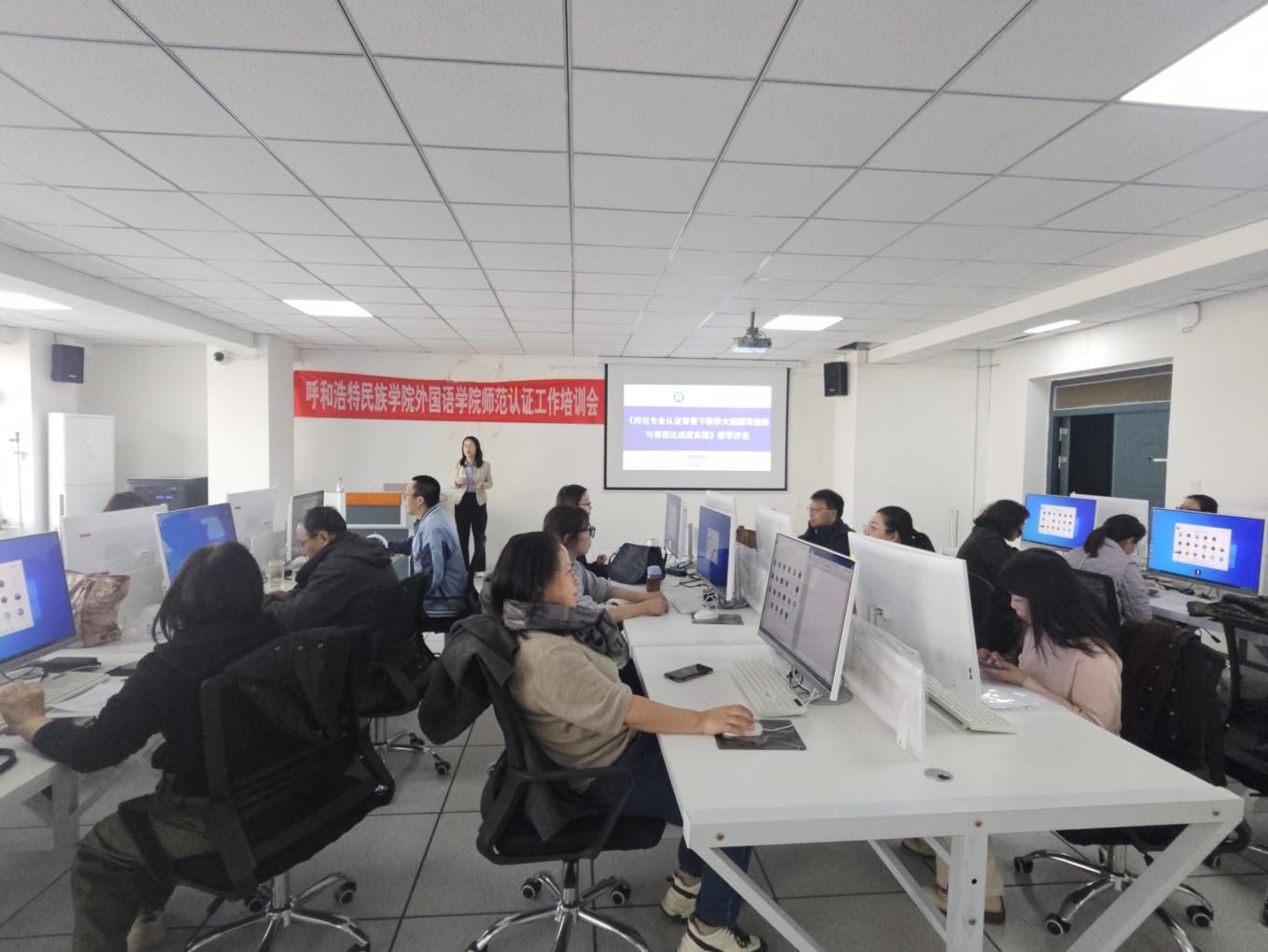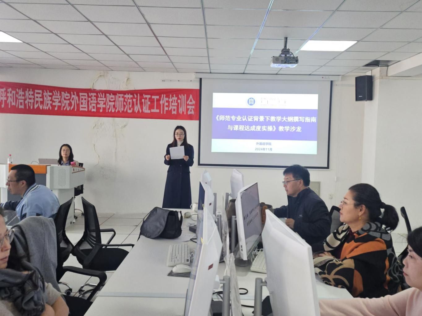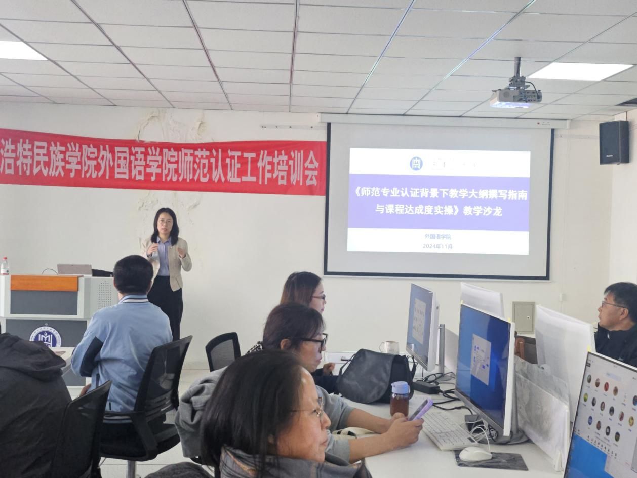11月14日,外国语学院成功举办了以《师范专业认证背景下教学大纲撰写指南与课程达成度实操》为题的教学沙龙。此次活动邀请了内蒙古师范大学外国语学院英语系的资深教师洪颖作为主讲嘉宾,外国语学院院长秦红喜、副院长红鸽及全体专任教师均积极参与。