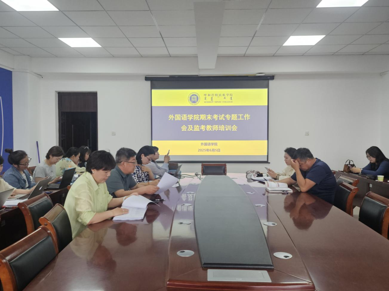 为进一步规范考试管理,严肃考风考纪,确保期末考试工作平稳有序开展,6月5日下午,外国语学院召开2024-2025学年第二学期期末考试工作部署暨监考培训专题会议。学院党总支书记朱俊杰、副书记红梅、教学副院长红鸽及全体教师参加会议。会议由红鸽副院长主持。