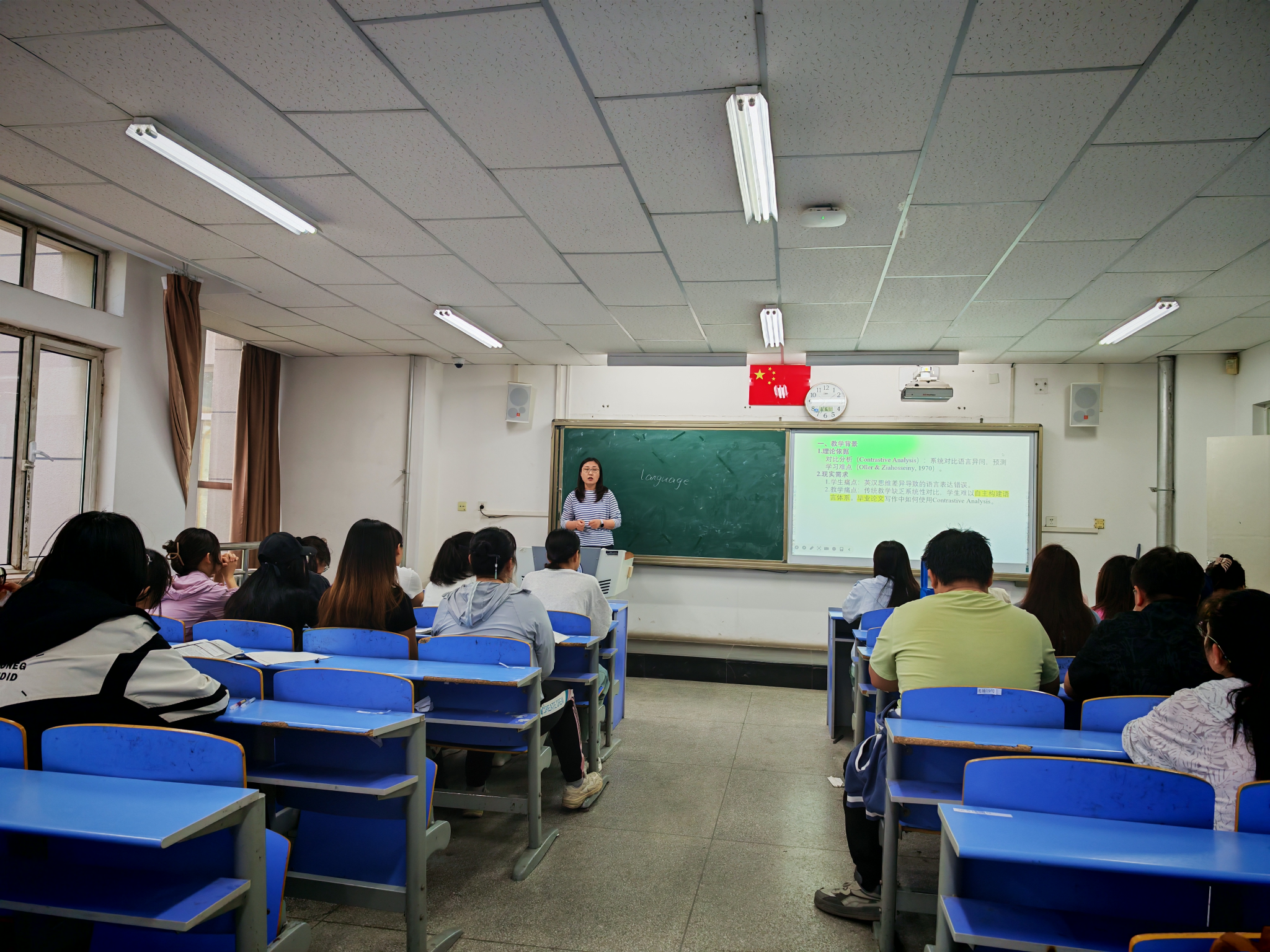 6月16日上午,在尚智楼309教室,英语教育教研室包丽娜老师成功开展了第二语言习得的公开课,课程内容聚焦于Unit 6 Analyzing Learner Language中的6.1 Contrastive Analysis (Method)。课程设计分为说课和讲课两个环节。