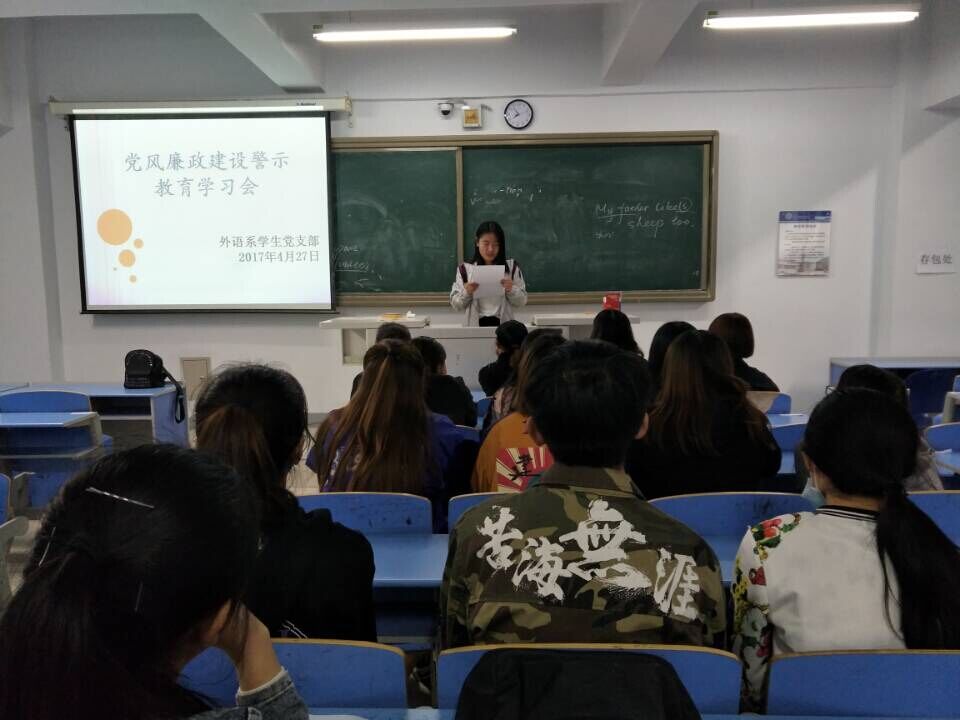为进一步加强反腐倡廉宣传教育,提高党员廉洁自律意识,筑牢拒腐防变的思想防线,推进反腐倡廉建设,2017年5月2日外语系开展党风廉政建设警示教育学习会,由预备党员王明珠进行讲解,外语系全体学生党员参加此次学习会。