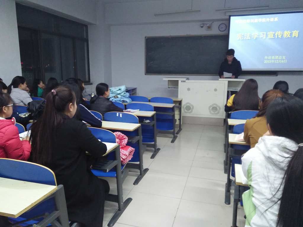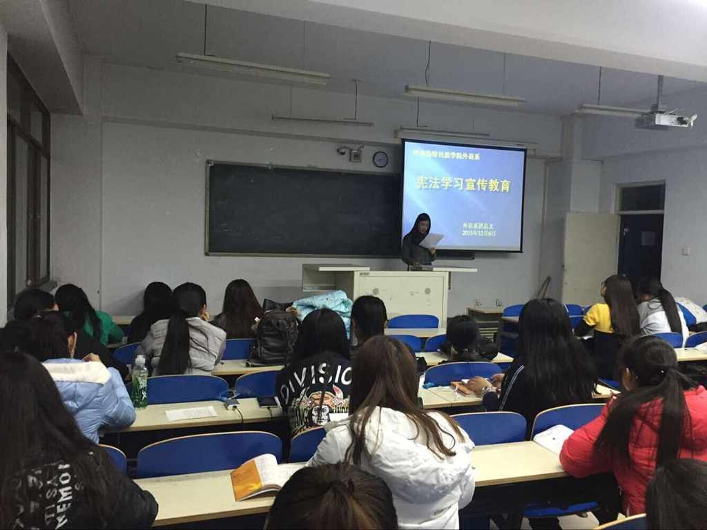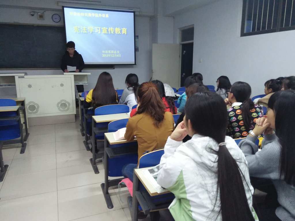 外语系团总支于2015年12月7日晚7:30时在都林楼602教室组织开展以“弘扬宪法精神▪构筑法治北疆”为主体的宪法宣传活动。活动现场,主持人以弘扬宪法精神为宗旨,以宪法基本原则和基本知识为重点向全体学生干部宣讲了中国特色社会主义社会主义宪法。加强宪法知识理论学习,强化宣传力度,深入开展教育活动,营造浓厚的法制宣传教育,教育学生知法、懂法、守法、提升法制观念,培育学生法制意识,把法律、法规、规章制度等内化为同学们的自觉行动。