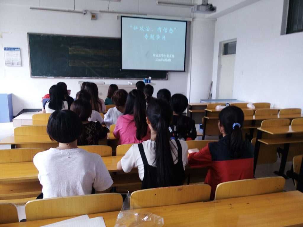 首先由支部书记以一名普通党员加入党组织的初衷为例谈起,阐述不同历史时期"讲政治、有信念"的具体内涵和时代意义,传达了关于树立"大局意识、团队精神、自律修养"的要求,并着重强调外语系学生党员要在组织上、学习上、生活上做到"讲政治、有信念"。