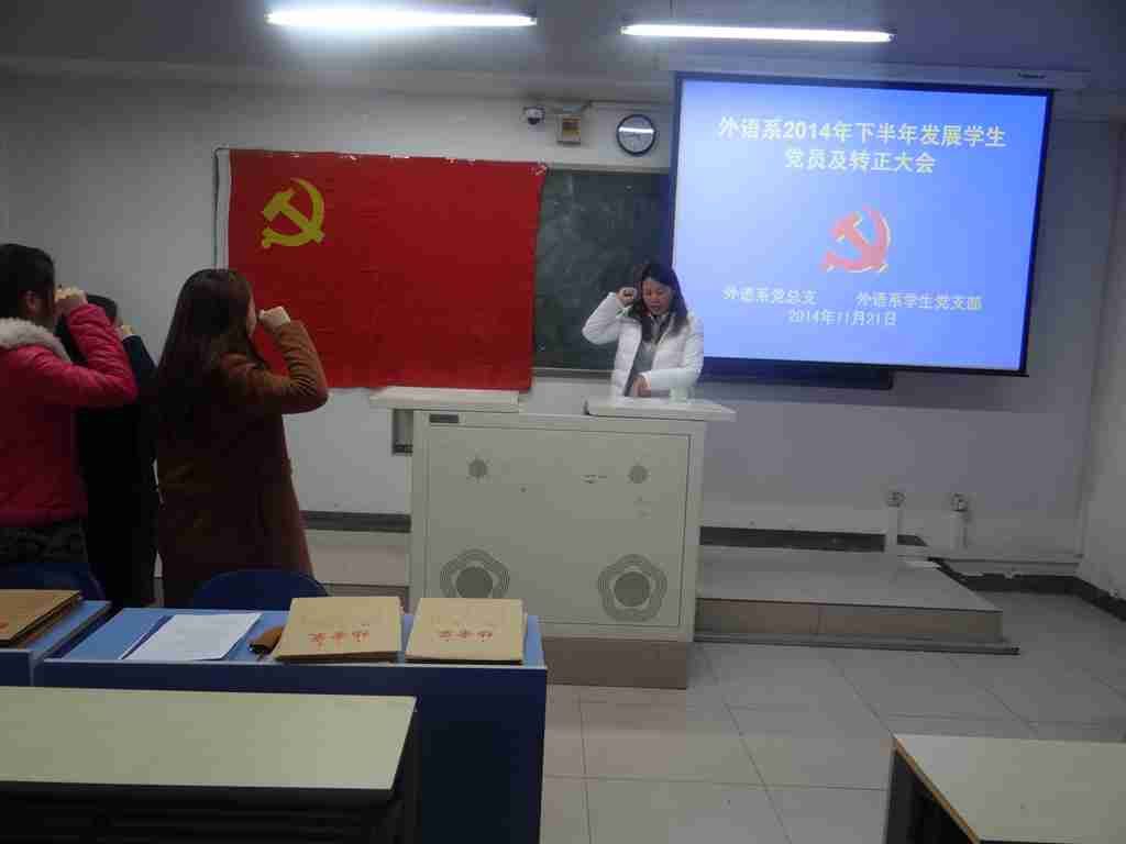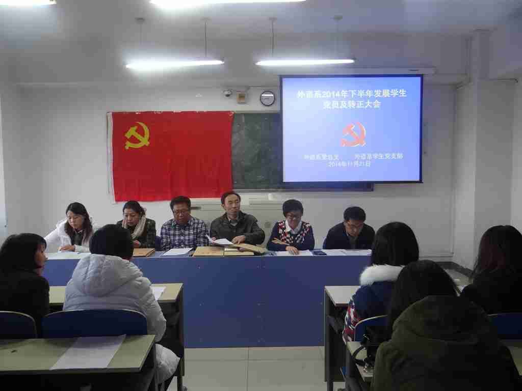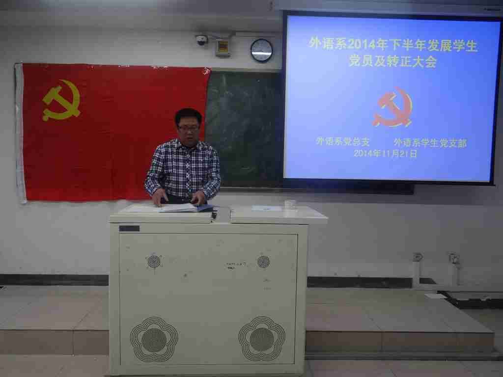 外语系于2014年11月21日晚,在新教610教室举办了“外语系2014年下半年发展学生党员及转正大会”。 外语系教职工及学生中共党员、学生中共预备党员共35人参加,会议由外语系副书记红梅主持。