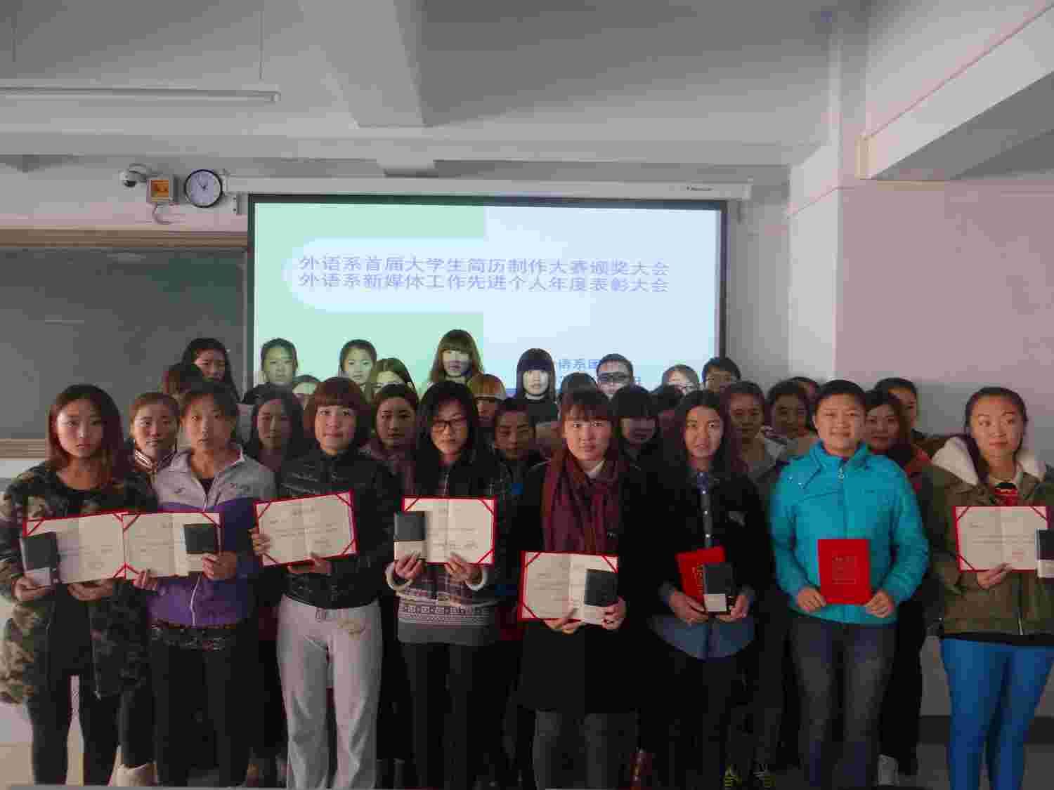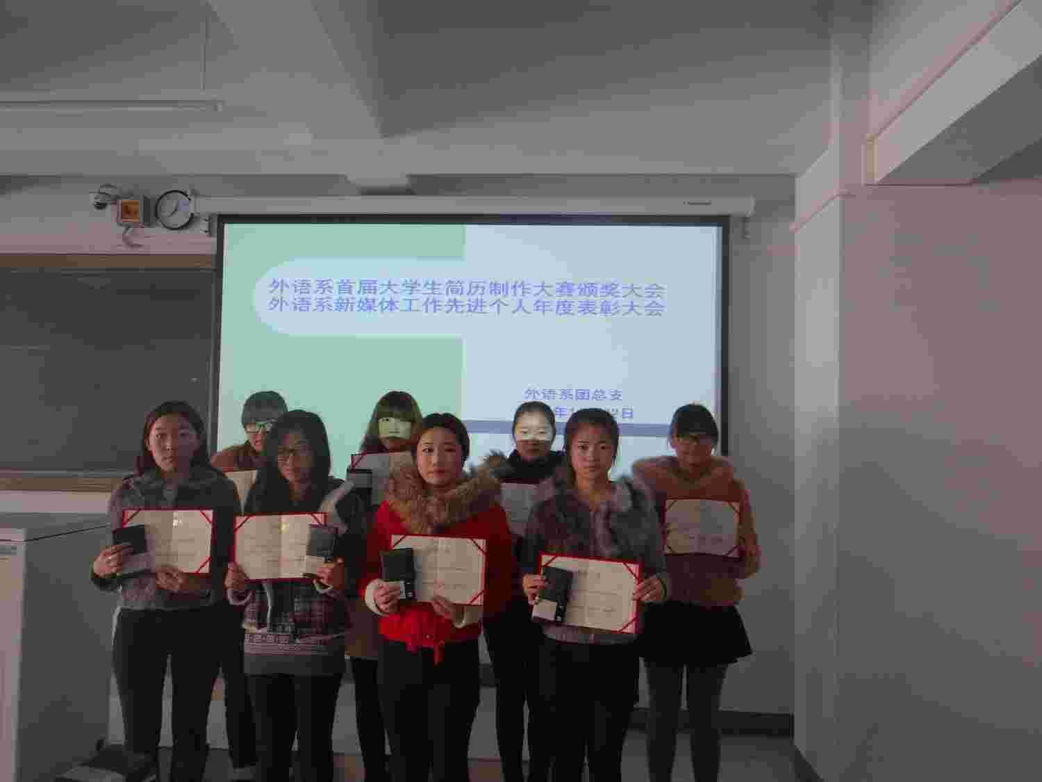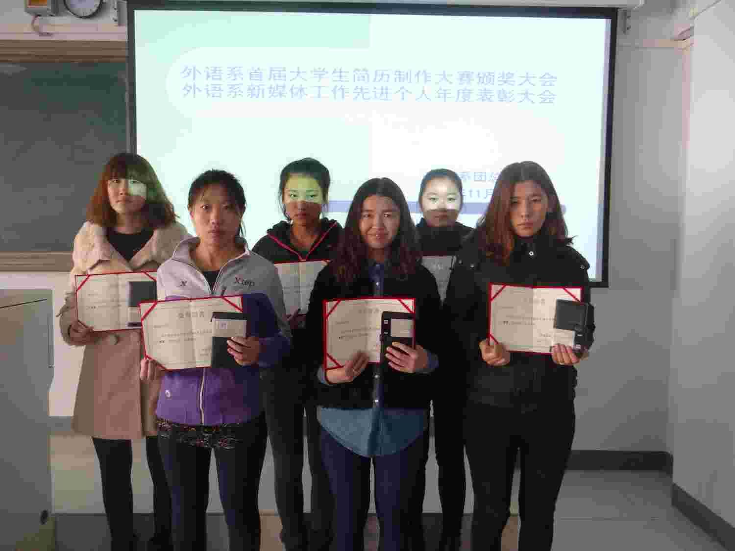 为进一步提升学生的简历制作水平和就业能力,引导学生尽早根据企事业单位的用人需求调整个人的职业生涯规划,提高学生的就业创业意识,外语系就业创业工作指导委员会、团总支于2013年10月25日至11月20日举办了“外语系首届大学生简历制作大赛”,本次比赛邀请学院就业指导中心主任杨福梅老师、就业指导科科长娜仁其木格老师担任了比赛评委,外语系共有290名同学参加了比赛。