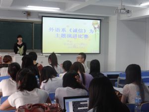 为使感恩、诚信思想深入学生头脑,外语系团总支于2013年6月8日在新教学楼618教室举办了《诚信》主题的演讲比赛。外语系23名选手参加了比赛。