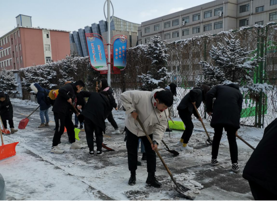 在活动中,同学们手持铁锹、扫帚等工具,以小组为单位分工协作,积极配合除雪工作,为清理出一条条安全的通道,同学们不顾天气严寒,尽管双手被冻的通红,也丝毫没有阻挡同学们积极除雪的热情,同学们劳动的身影成为校园内一道亮丽的风景线。在除雪过程中,同学们有的铲、有的扫,干劲十足,经过两个多小时的努力,终于将道路打扫干净。