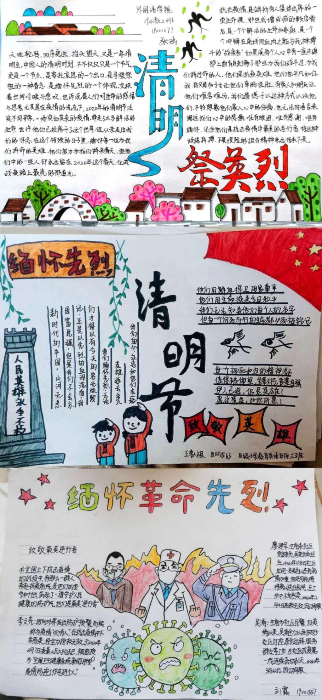外国语学院面向全体学生召集作品,活动以手抄报展出的形式开展,大家用手中的笔,表达对革命烈士的缅怀以及对祖国由衷的热爱。在征集作品时,同学们充分利用各种课外资料对版面进行创意制作,使得手抄报内容清晰明了,通俗易懂并能突出主题。同学们用绚丽的图案、生动的语言、真实的情感,绘出自己对于革命先烈的无尽崇敬与无限深情并表现出对于传承中国民族文化,弘扬爱国主义精神的思想。