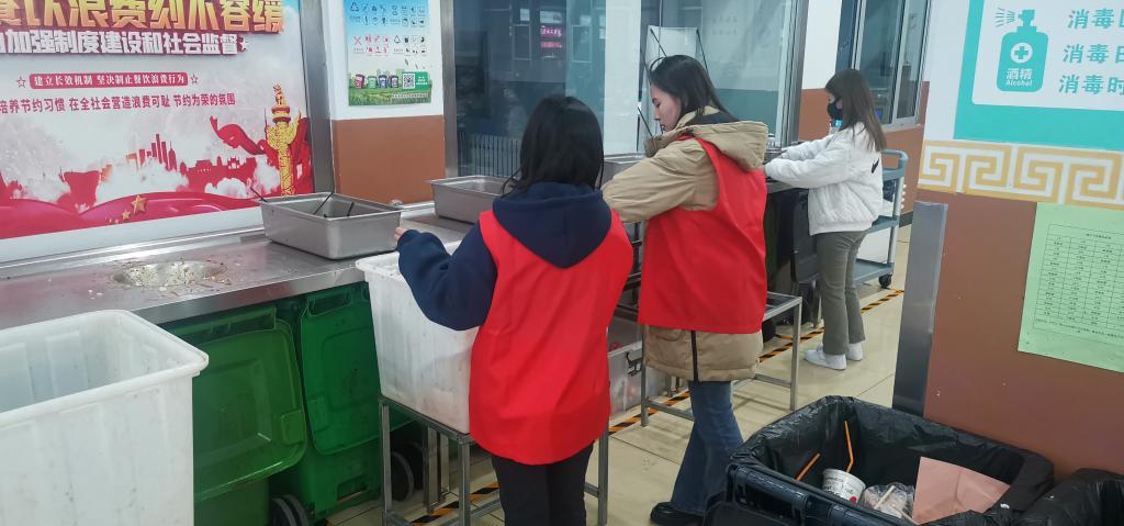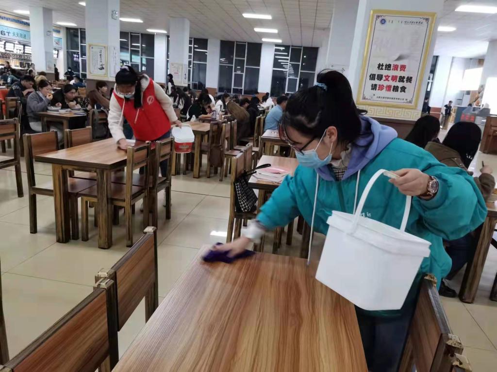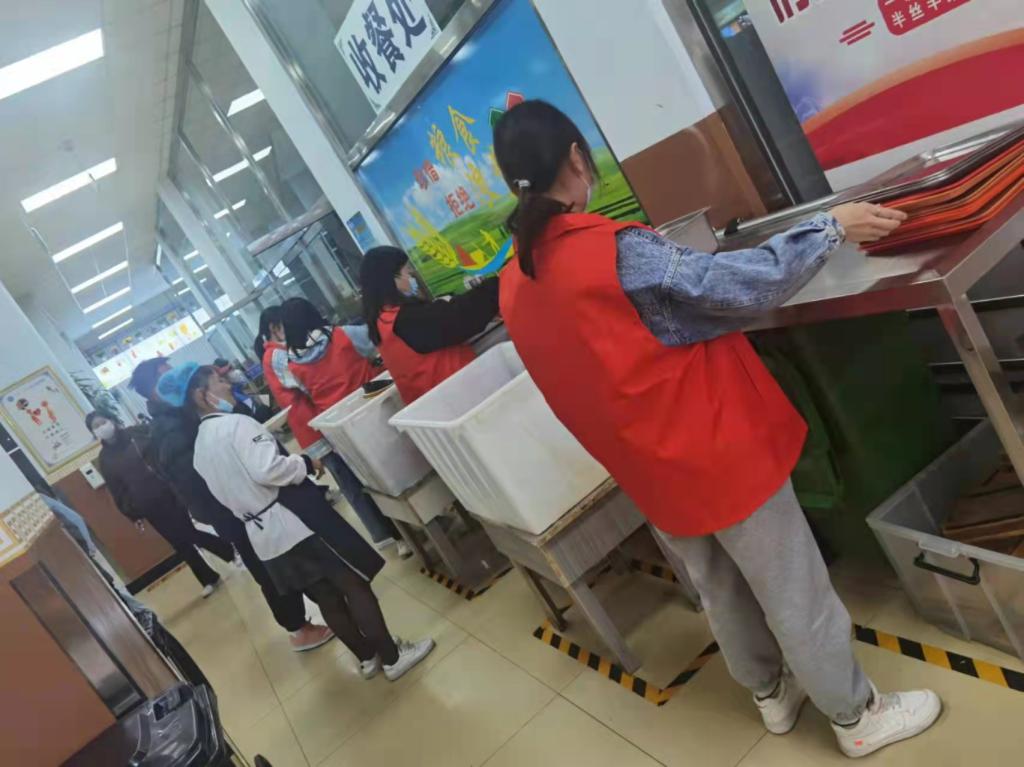活动伊始,负责人向积极分子志愿者分配任务,志愿者们到各自志愿者服务岗位上开始工作。擦桌子的志愿者在食堂走动检查,以确保餐桌上的饭渣能够及时清理,保证同学们的用餐环境;整理餐具的志愿者对于没有回收的餐具及时回收。志愿者们工作态度认真负责,全身心地投入到本次服务活动中。最后,积极分子志愿者们努力地完成了服务活动任务,为食堂阿姨减轻工作负担,彰显了志愿者的奉献精神。