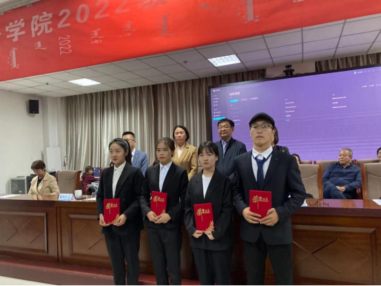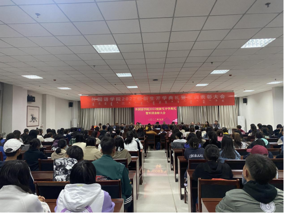 大会在庄严的国歌声中拉开帷幕。首先,肖查娜院长对全体2022级新生的到来表示热烈的欢迎,并详细介绍了外国语学院办学基本情况及发展现状,并逐一向新生介绍各位老师。肖院长寄语2022级新生,希望他们珍惜宝贵的学习机会,未雨绸缪、虚心向学、会通中外、见贤思齐、不负青春、早日成材。随后,教师代表吴丹副教授、在校生代表2019级小学教育(英语方向)三班马璐、新生代表2022级日语班云静分别发言,我院优秀毕业生代表,现于中国传媒大学攻读硕士研究生的娜仁通力嘎同学以视频形式和新生分享了心得感悟。党总支副书记红梅宣读《外国语学院关于表彰2022级新生军事技能训练优秀标兵和优秀学生干部的表彰决定》,并由与会老师为获奖学生颁发荣誉证书。