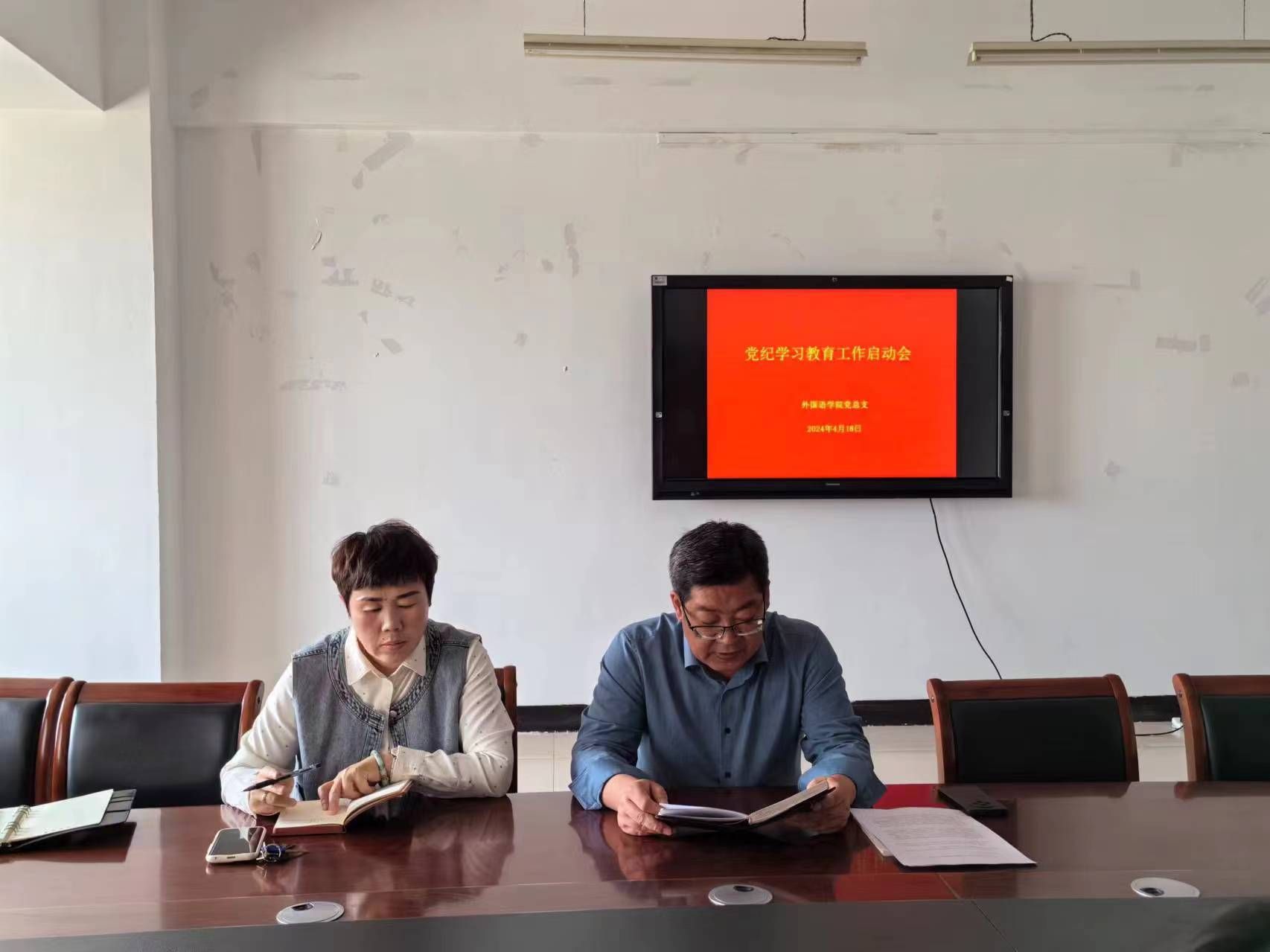 为学习贯彻落实党中央、自治区党委、校党委关于党纪学习教育工作的安排部署,4月18日,外国语学院在都林楼611室召开党纪学习教育启动部署工作会议。会议由外国语学院党总支书记朱俊杰主持,学院党总支、各党支部书记委员、无课党员师生参加会议。