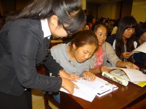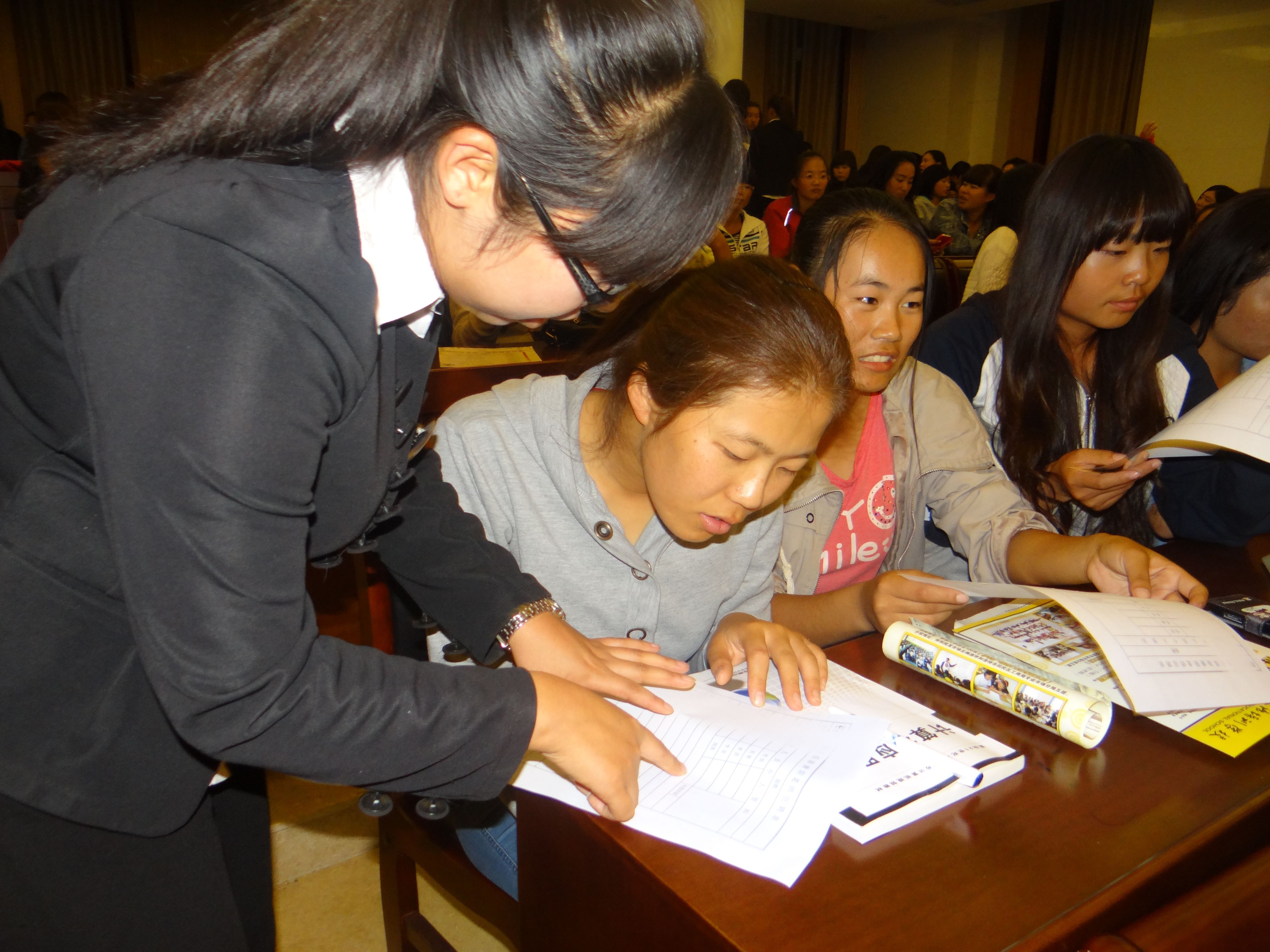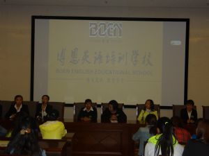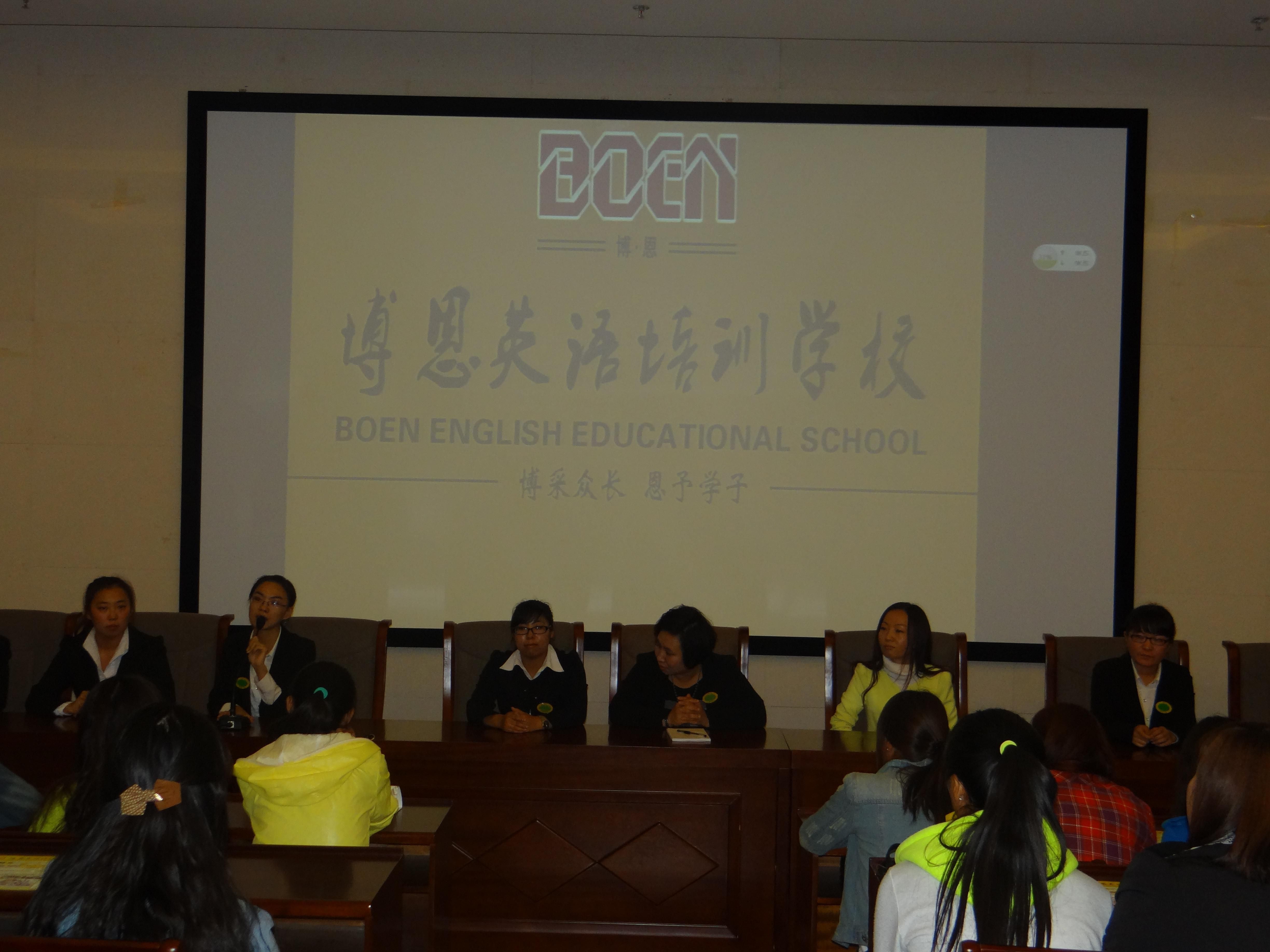 博恩英语培训学校的王荣主任用一段记载了博恩十几年来成长历程的PPT资料向大家介绍了博恩英语学校一流的办学环境、高素质的中外教师团队、严格的教学管理和生动新颖的授课模式,使大家对博恩英语培训学校有了全方位的了解。接着她对招聘的专职、兼职助教工作岗位进行了详细的说明;去年从呼市职业学院毕业,现担任该校助教及讲师的4名老师也与大家分享了自己在博恩英语培训学校的奋斗和收获。