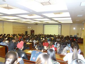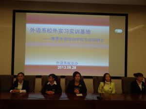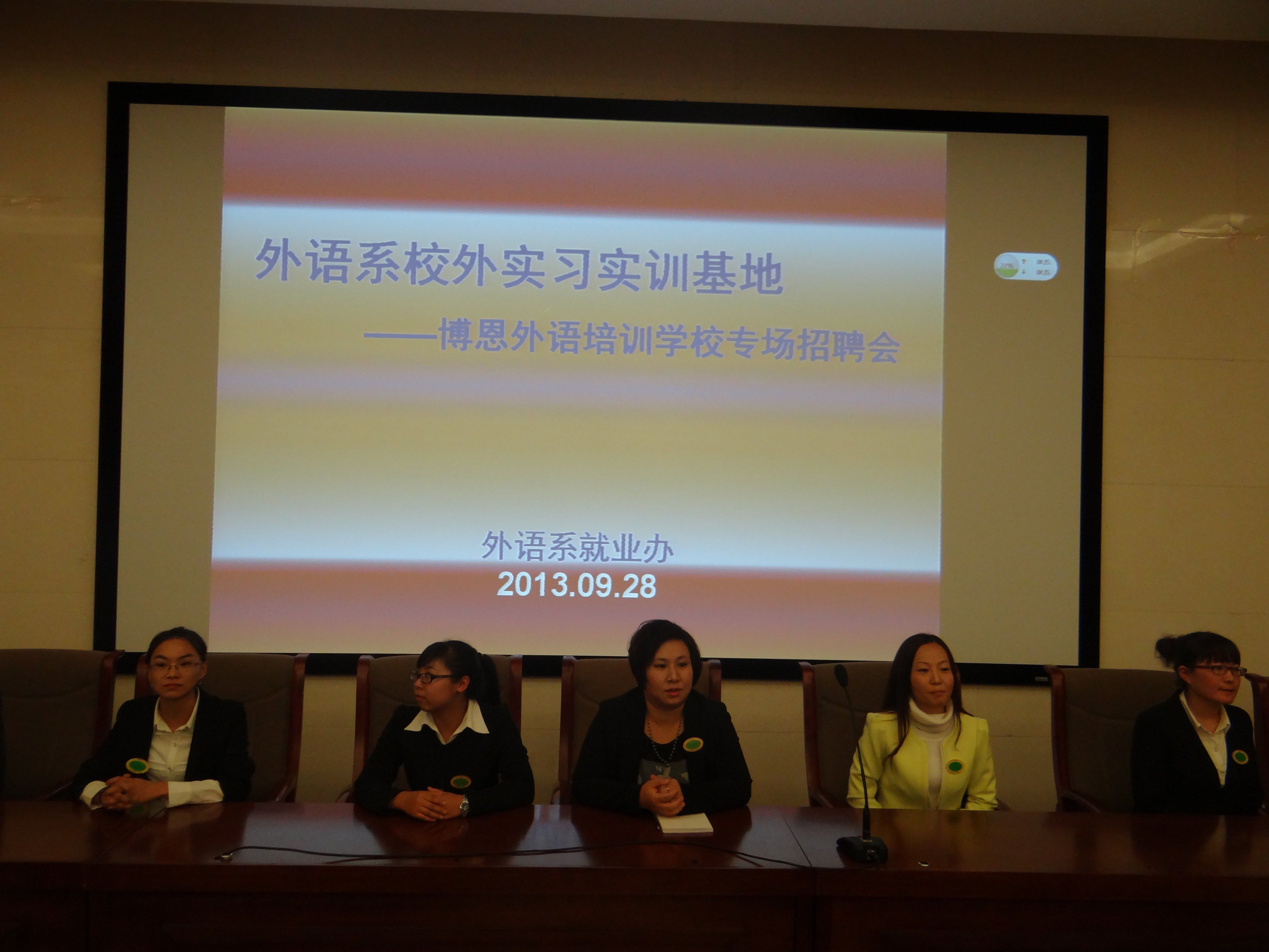 2013年8月29日晚8:10,我系在学院图书馆一楼报告厅举办了博恩英语培训学校专场招聘会。博恩英语培训学校校长哈晓红、副校长刘晓燕、教务主任王荣、我系团总支书记包仓老师及外语系2012级、2013级英语专业近300名学生出席了本次招聘会。