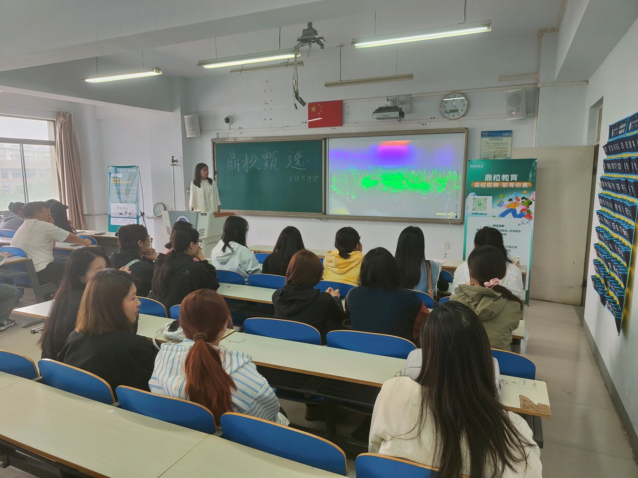 招聘会上,鼎校集团校招负责人廉佳荣详细介绍了鼎校集团目前承载的业务和岗位需求,诚邀英语听说读写能力强、致力于青少年外语能力素质教育的毕业生加盟该公司。交流互动环节,廉老师为我院有就职意向的同学进行了问题解答。目前,有10余名学生准备竞聘该公司英语教练师职位。