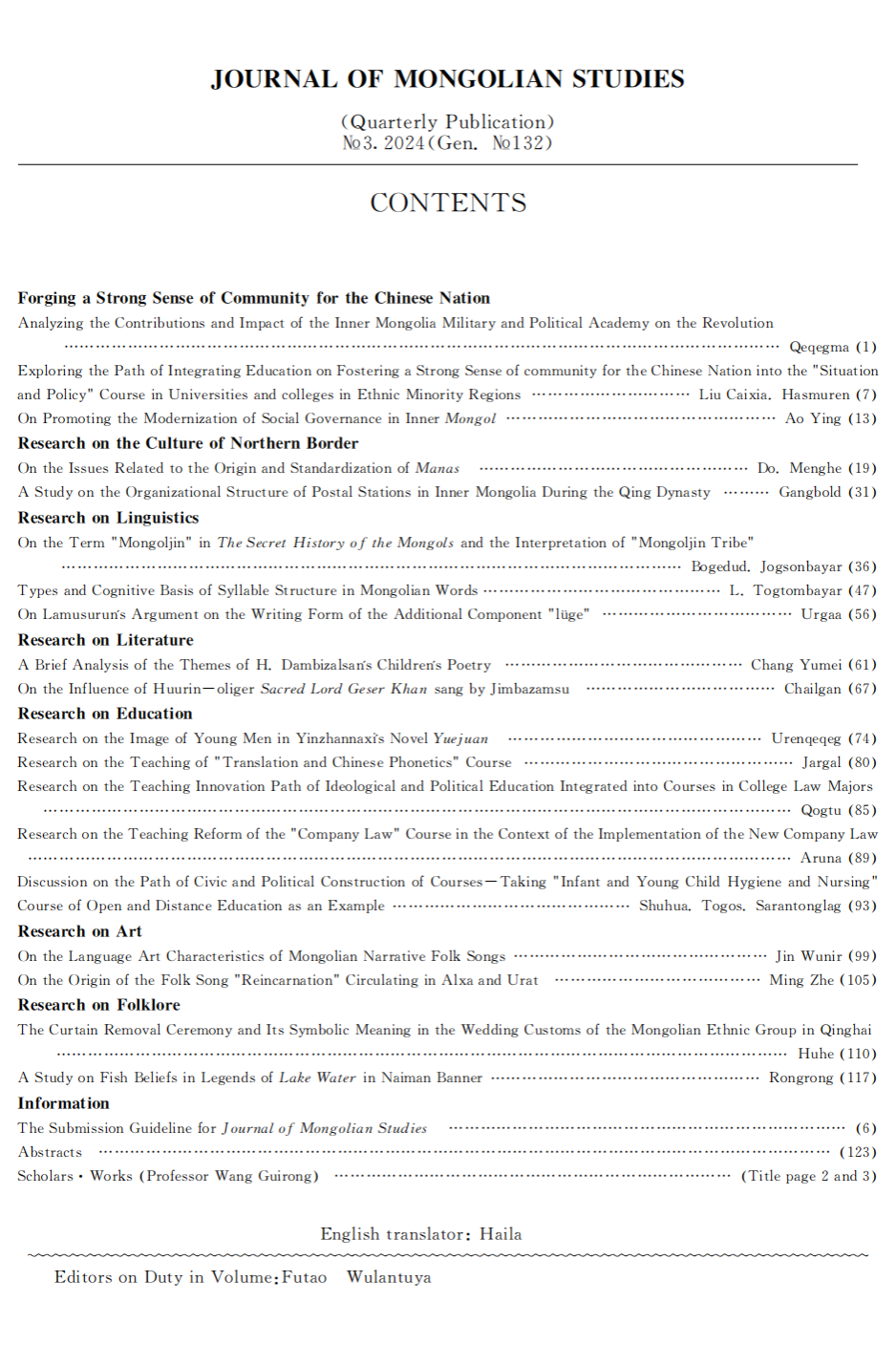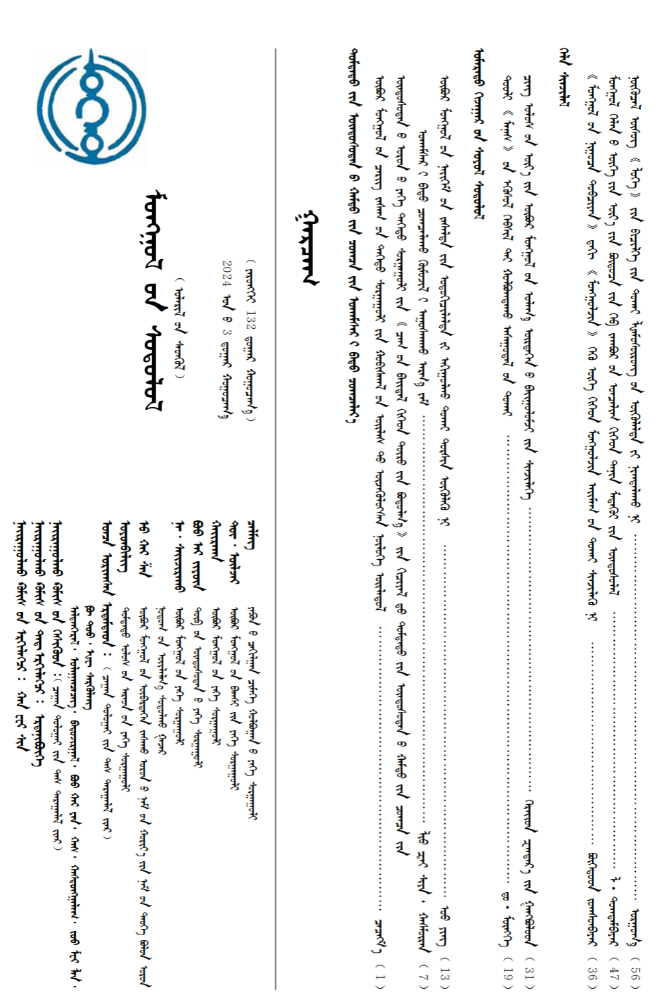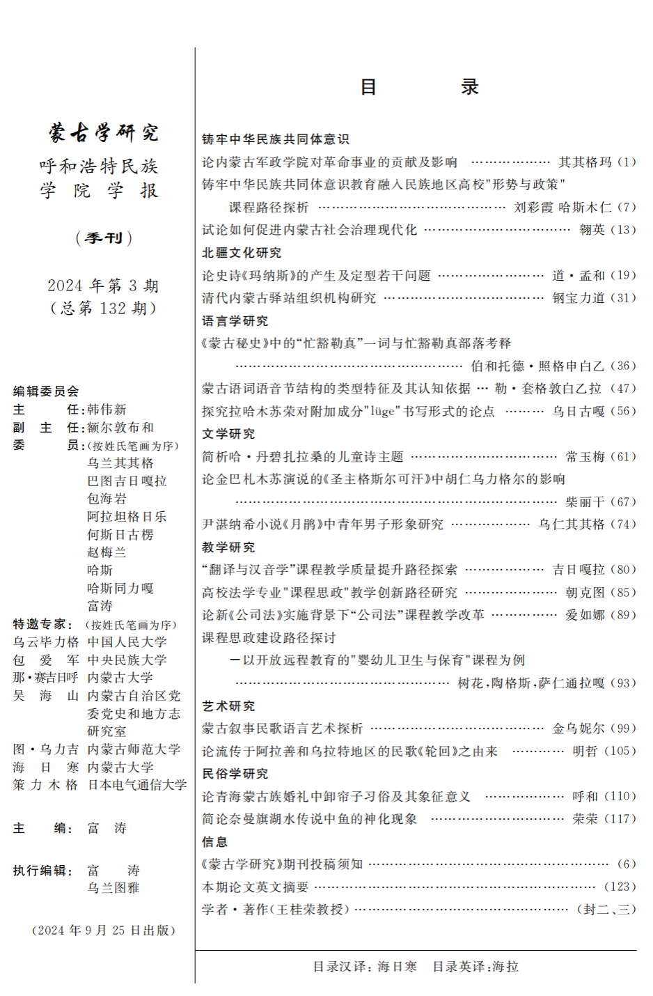 《蒙古学研究》2024年3期蒙汉英目录