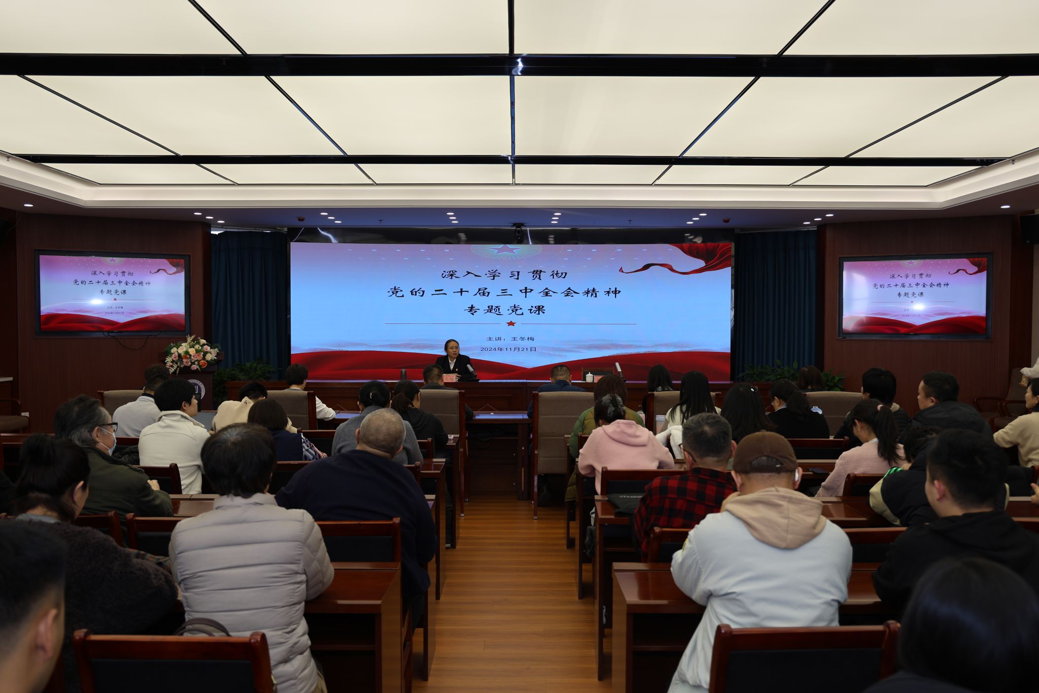11月21日,校党委委员、纪委书记、监察专员王冬梅在综合楼12楼会议室为联系单位师生党员和联系班级讲授了党的二十届三中全会精神专题党课。纪委监察专员办公室,巡察工作领导小组办公室、美术与设计学院、计算机与信息技术学院全体教职工、学生党员以及美术与设计学院2022级视觉传达设计专业班级学生120余人聆听了党课。