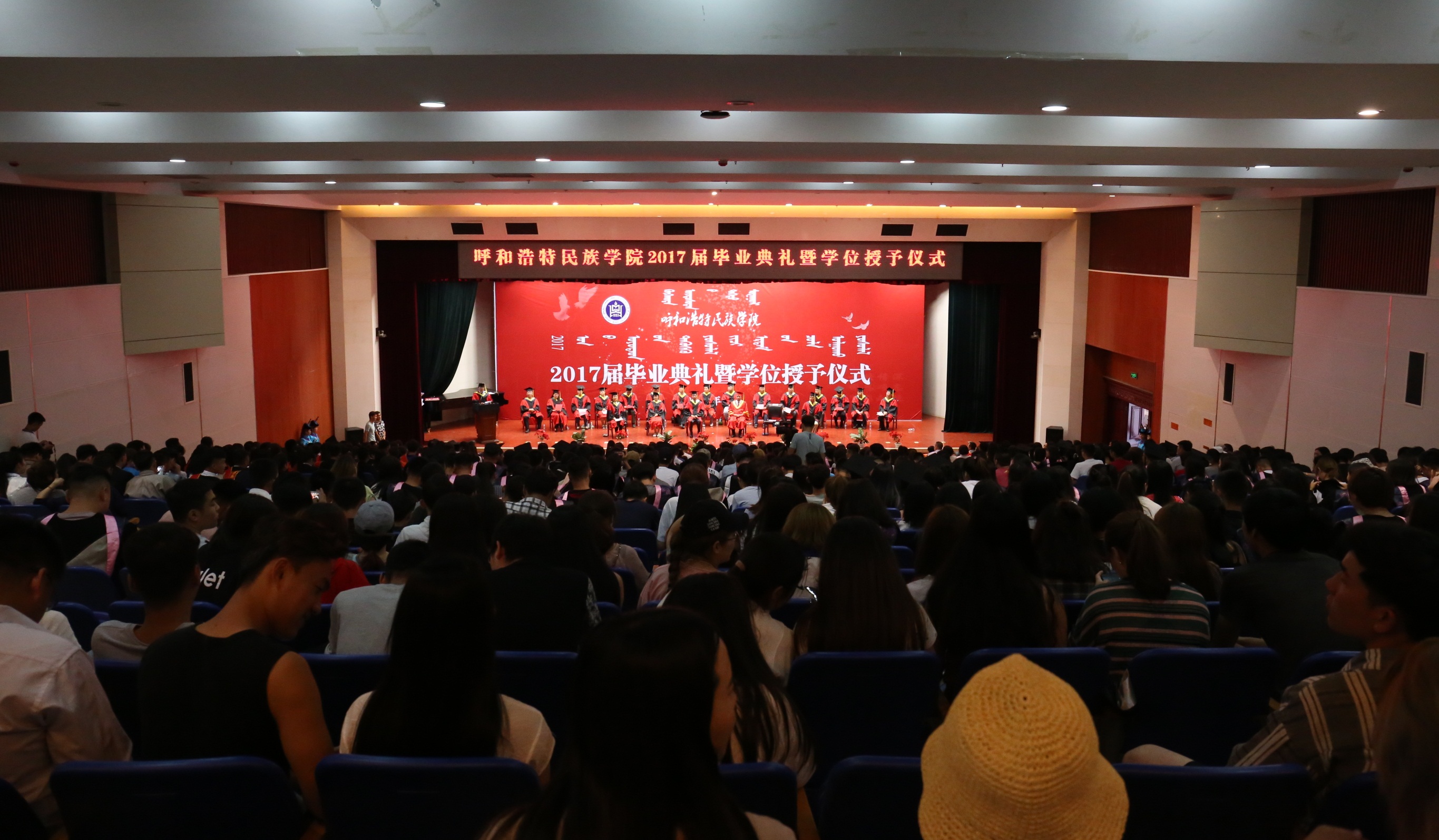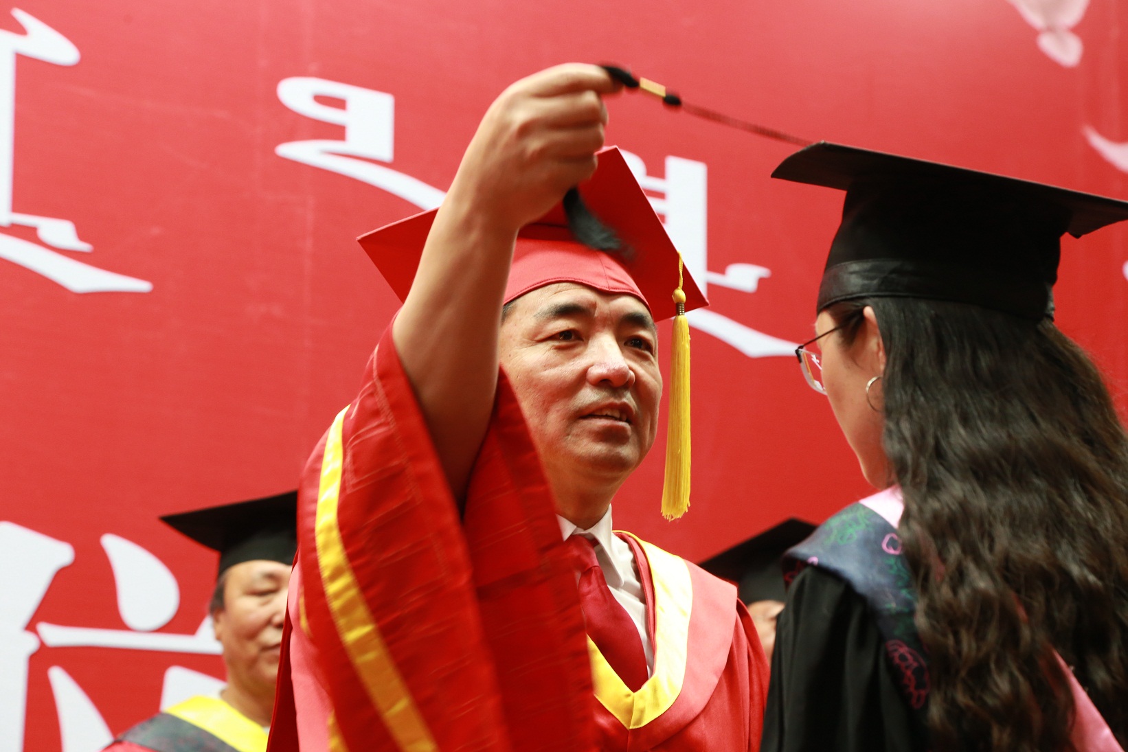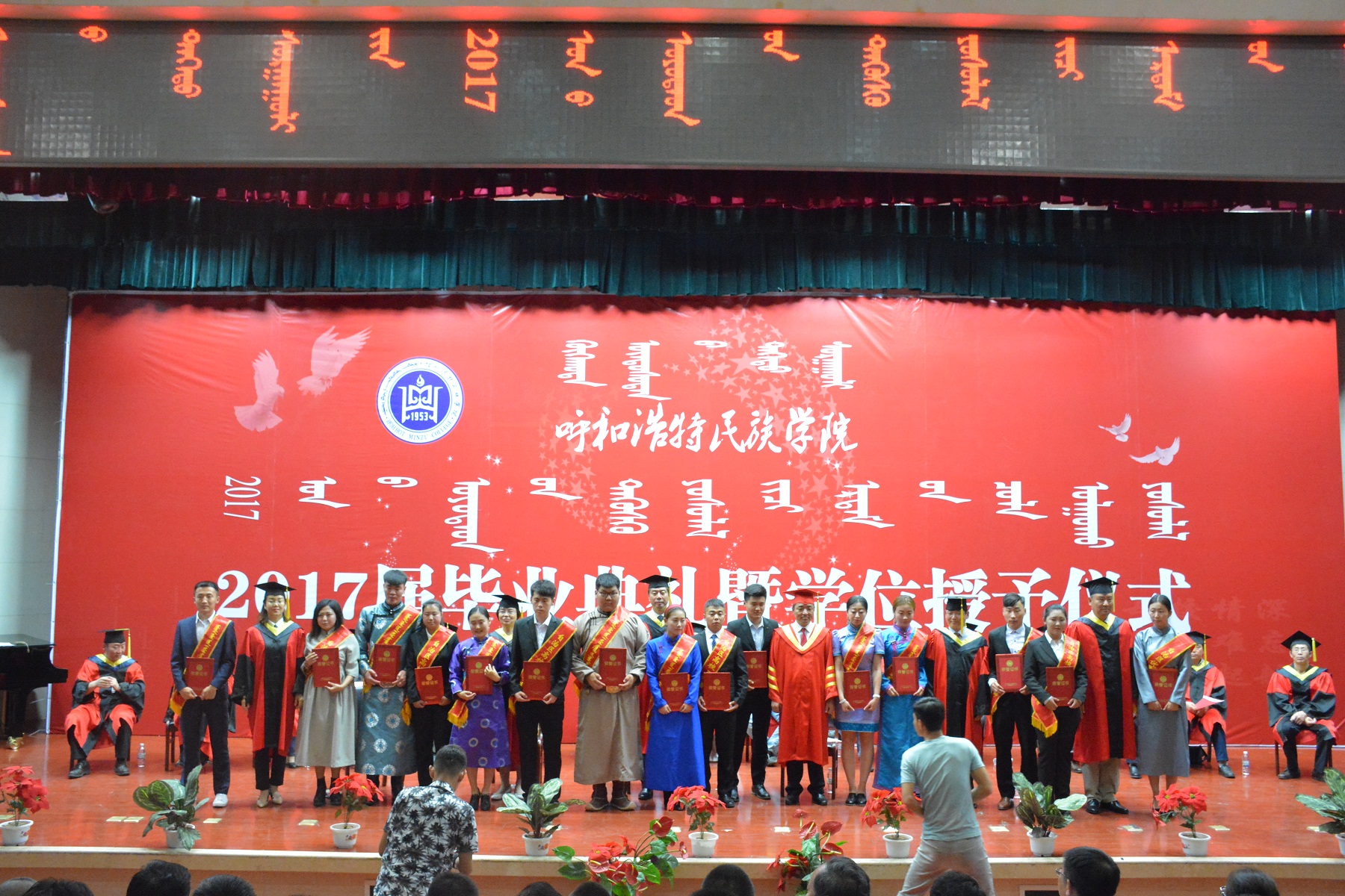 仪式上,教务处副处长胡毕斯哈拉图宣读了学校2017届学生毕业情况;全体学校领导为2017届毕业生颁发了毕业证书。学校学位委员会主任格日乐图院长及主席台领导为获得学士学位的毕业生代表授予学位并行拨穗礼。主席台上的每一位老师与毕业生握手祝贺、毕业快乐、拨穗行礼、合影留念,与同学们简短交流,祝福同学们前程似锦。