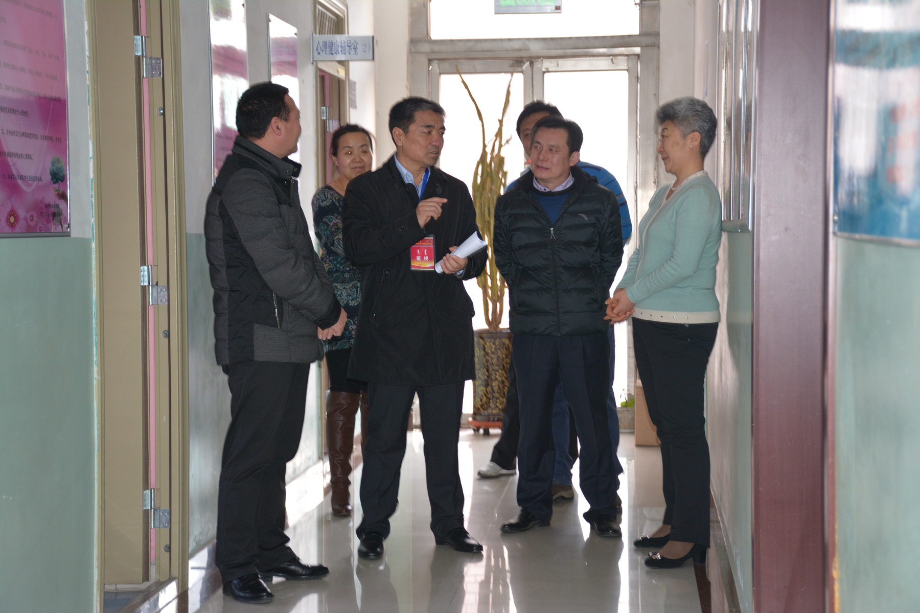 2015年12月15日下午3:00,格日乐图院长在院办单春伟主任的陪同下,到学生处心理咨询室、沙盘室、发泄室视察。格院长详细了解了我院大学生心理健康辅导工作的现状和困难,并对如何开展好我院大学生心理健康教育工作提出了具体要求和指导意见。
