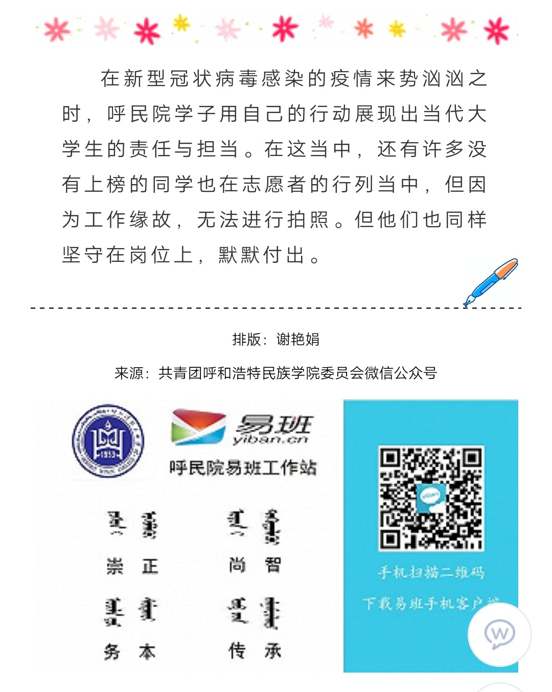 上一条:【重磅】疫情当前,呼民院学子志愿者展现青春使命 (三)