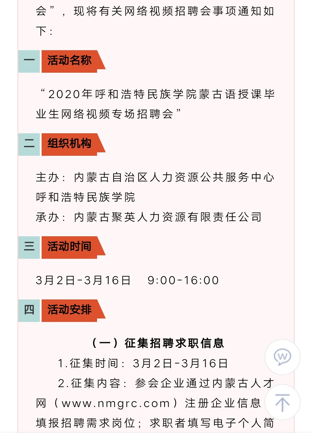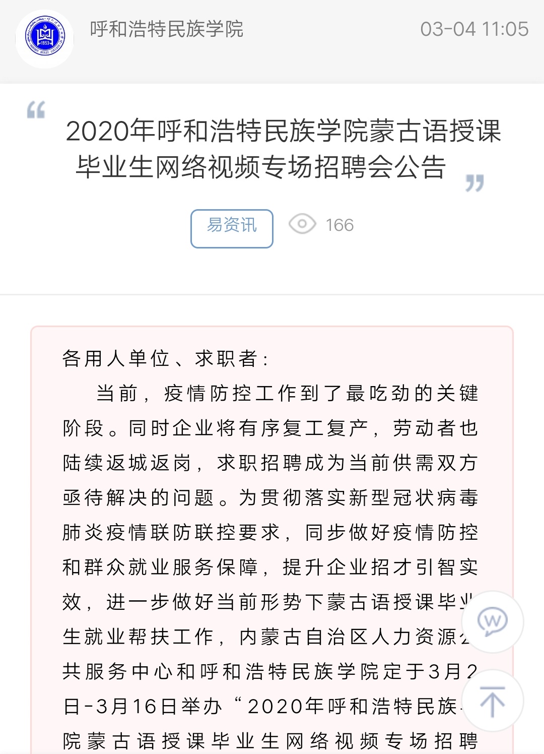 2020年365英国上市公司蒙古语授课毕业生网络视频专场招聘会公告