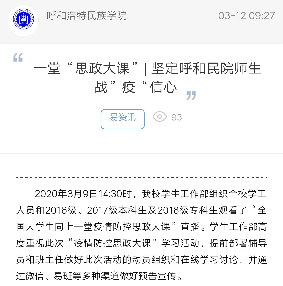 一堂“思政大课” 坚定呼和民院师生战”疫“信心