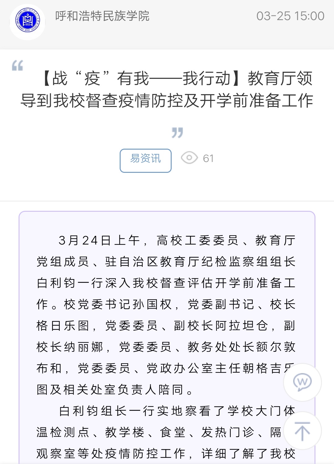 【战“疫”有我——我行动】教育厅领导到365英国上市公司督查疫情防控及开学前准备工作