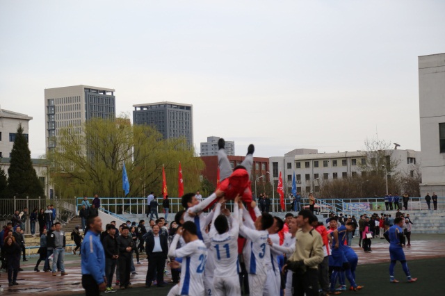 决赛是由我院男子足球队对战内蒙古民族大学男子足球队。伴随着球场上两短一长的终场哨声,我院男子足球队不负众望以1比0战胜内蒙古民族大学男子足球队,最终获得内蒙古自治区第十届大学生运动会足球比赛暨内蒙古自治区校园足球“主席杯”预选赛校园组冠军。