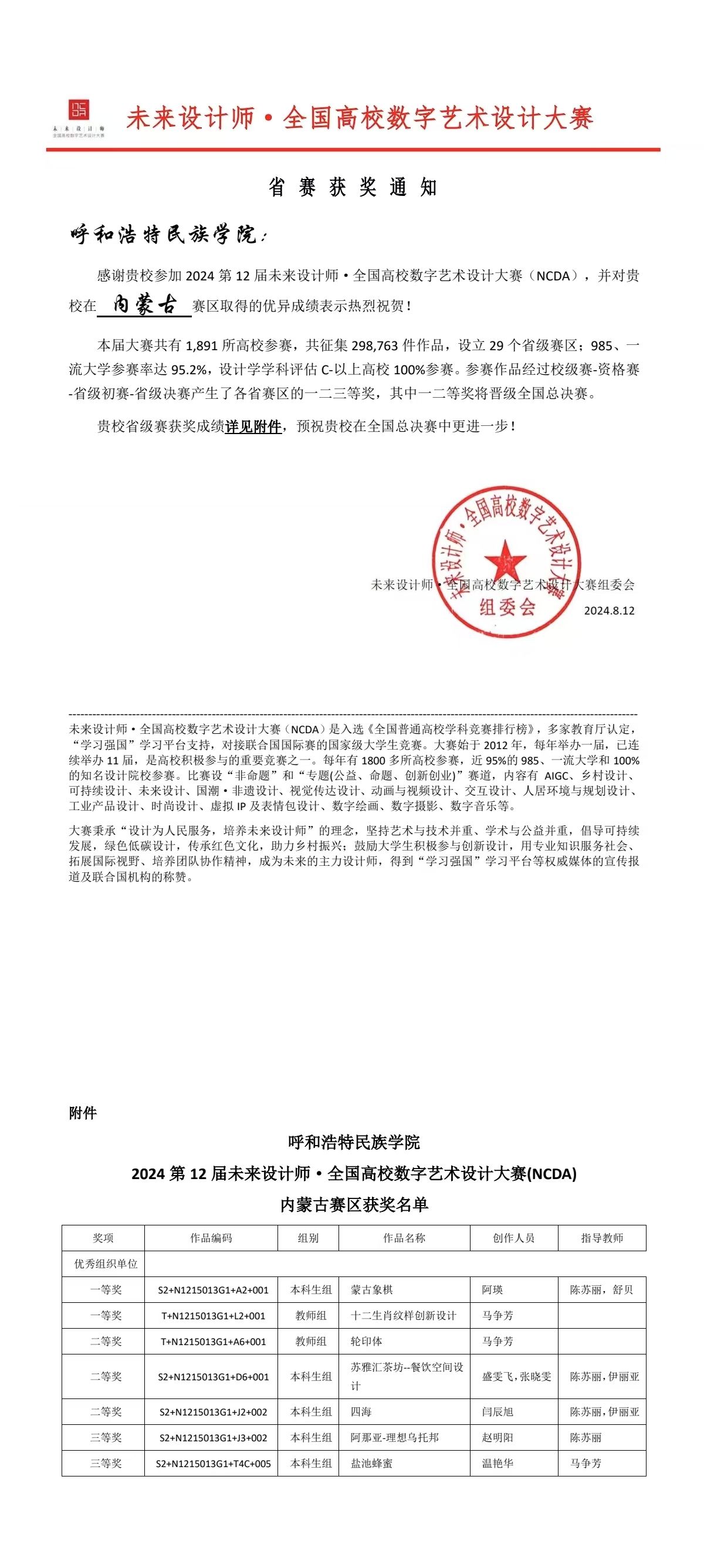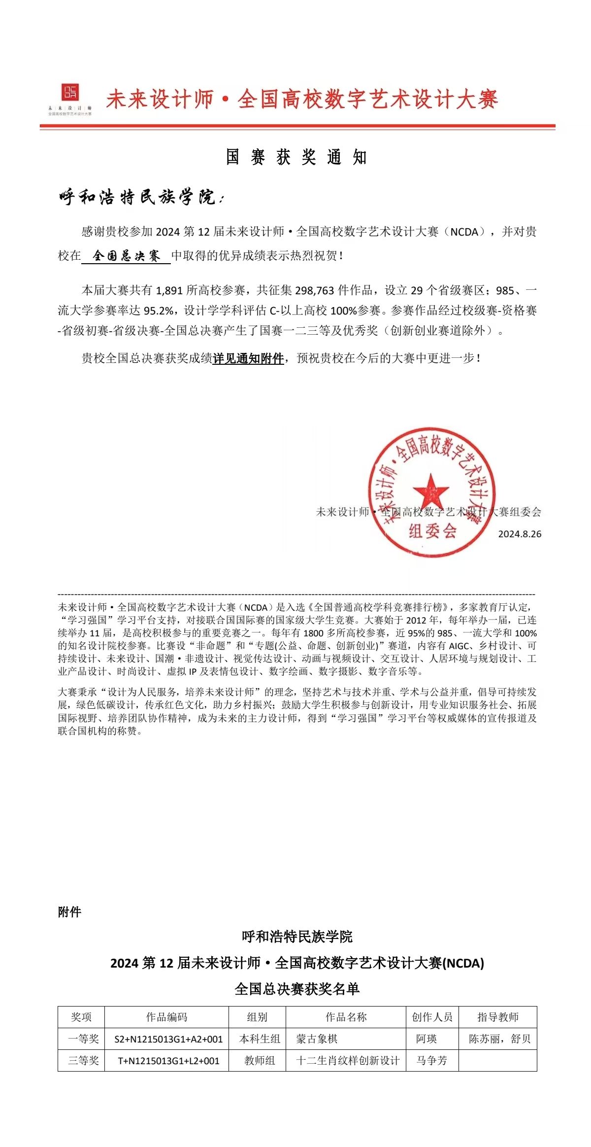 近日,2024年(第十二届)未来设计师·全国高校数字艺术设计大赛(NCDA)全国总决赛结果揭晓。由365英国上市公司美术与设计学院4名教师参与和指导的7个作品分别获得了国家级和内蒙古赛区一、二、三等奖的好成绩。学校被评为省级“优秀组织单位”。