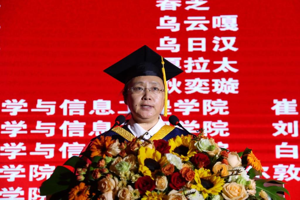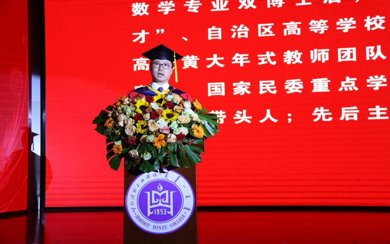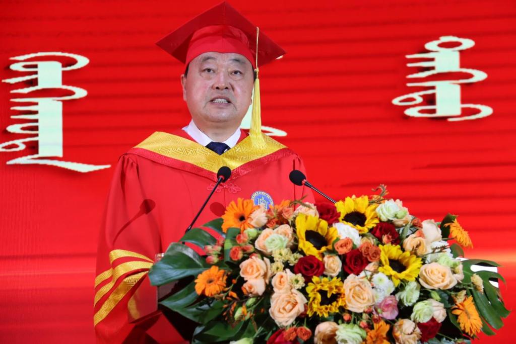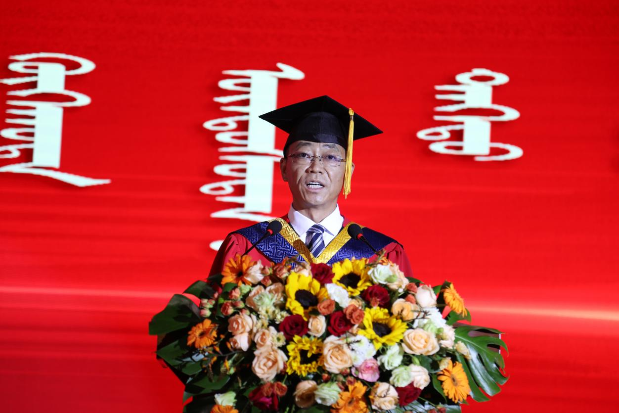 学位委员会副主任、党委委员、教务处处长额尔敦布和教授作为教师代表发言,他真诚祝贺同学们顺利完成学业,希望同学们争做有正气、有责任、有原则、有志向的青年一代。