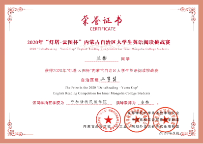 姜启龙在2015年“外研社杯”全国英语阅读大赛内蒙古赛区复赛中获得一等奖